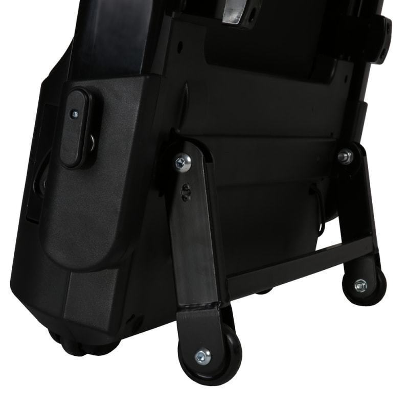 Перемещение дорожки происходит за счет транспортировочных роликов. Устойчивость в вертикальном положении придает специальная стальная подставка. Подставка выдвигается автоматически при перемещении дорожки в вертикальное положение.