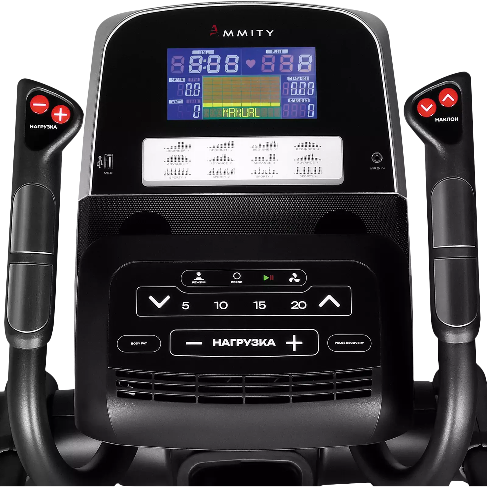 Контроль и измерение пульса возможны с помощью встроенных датчиков или беспроводного нагрудного датчика 5 кГц. Телеметрический кардиопояс не входит в комплект поставки тренажера.