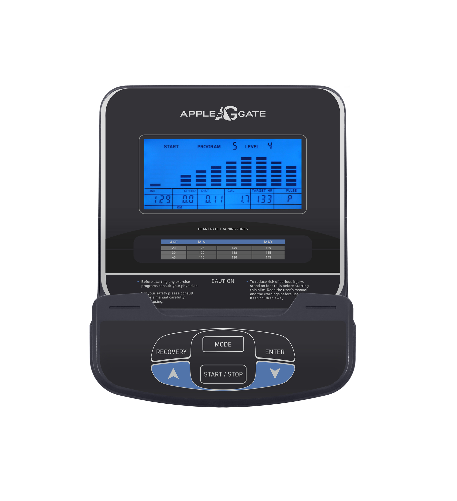 Тренировочный компьютер представлен голубым LCD-дисплеем диагональю 14 см с профилем тренировки. В программный пакет входят 7 предустановленных программ, направленных на тренировку скоростных качеств, выносливости, укрепления сердечно-сосудистой системы и похудания. Помимо этого, можно воспользоваться самостоятельно регулируемым ручным режимом, а также создать собственную программу. Для тренировок с контролем пульса существуют 4 пульсозависимые программы. 3 их них имеют предустановленные значения 60%, 75%, 85% от максимального пульса (точная цифра частоты сердечного ритма определяется исходя из возраста пользователя). 4 программа позволяет установить любой целевой пульс. Еще одна функция - жироанализатор Body Fat - даст оценку параметрам, связанным с весом (в том числе BMI (Индекс массы тела) и BMR (Базовый индекс метаболизма)). По завершении тренировки функция Recovery оценит способность сердечно-сосудистой системы к восстановлению.