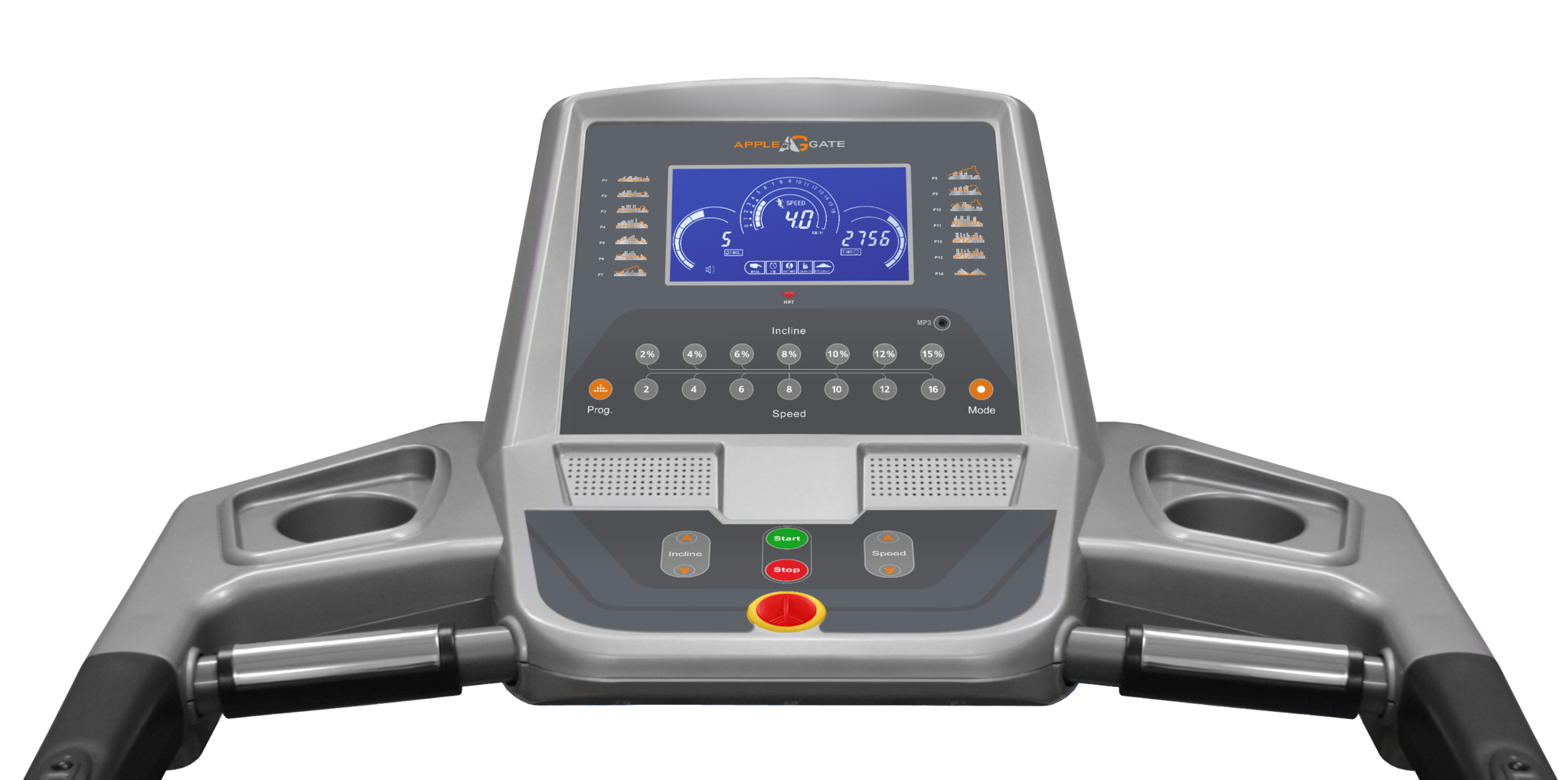 Тренировочный компьютер представлен голубым дисплеем диагональю 18 см. На экран одновременно выводятся все основные параметры тренировки – время, скорость, дистанция, потраченные калории, угол наклона и пульс. В программный пакет входят 14 предустановленных программ, направленных на тренировку скоростных качеств, выносливости, укрепления сердечно-сосудистой системы и похудания. Помимо предустановленных программ, можно воспользоваться самостоятельно регулируемым ручным управлением или создать собственную программу в одном из 3-х пользовательских режимов. Для считывания показаний пульса в поручни дорожки вмонтированы контактные сенсорные датчики (также можно измерить пульс телеметрическим датчиком). Там же находятся так называемые "быстрые клавиши" управления, благодаря им можно отрегулировать скорость либо угол наклона, не снимая рук с поручней.