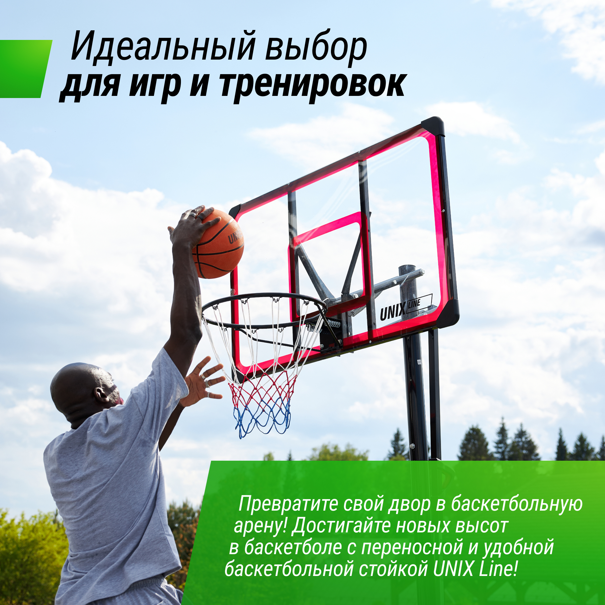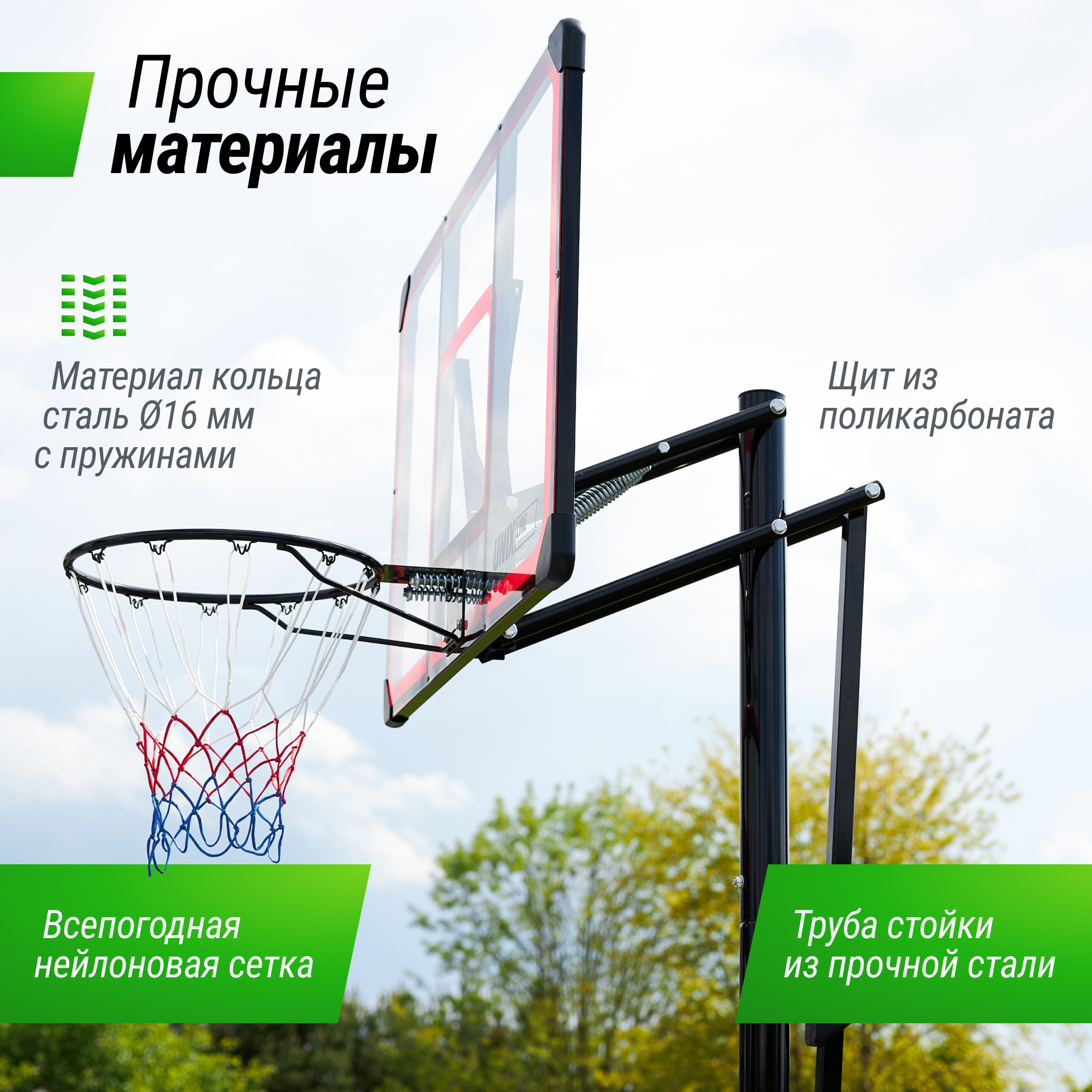 Мобильная баскетбольная стойка UNIX Line производится из стали с защитным полимерным покрытием. Собирается как конструктор по частям, которые фиксируются замковым соединением. Сооружение используется как в закрытых помещениях, так и для уличных соревнований. Команда может перевозить свое оборудование на другие площадки - стойки разбираются, складываются и легко переносятся. Стойки можно использовать в помещении и на улице. Данная система не предназначена для детей младше 3 лет.