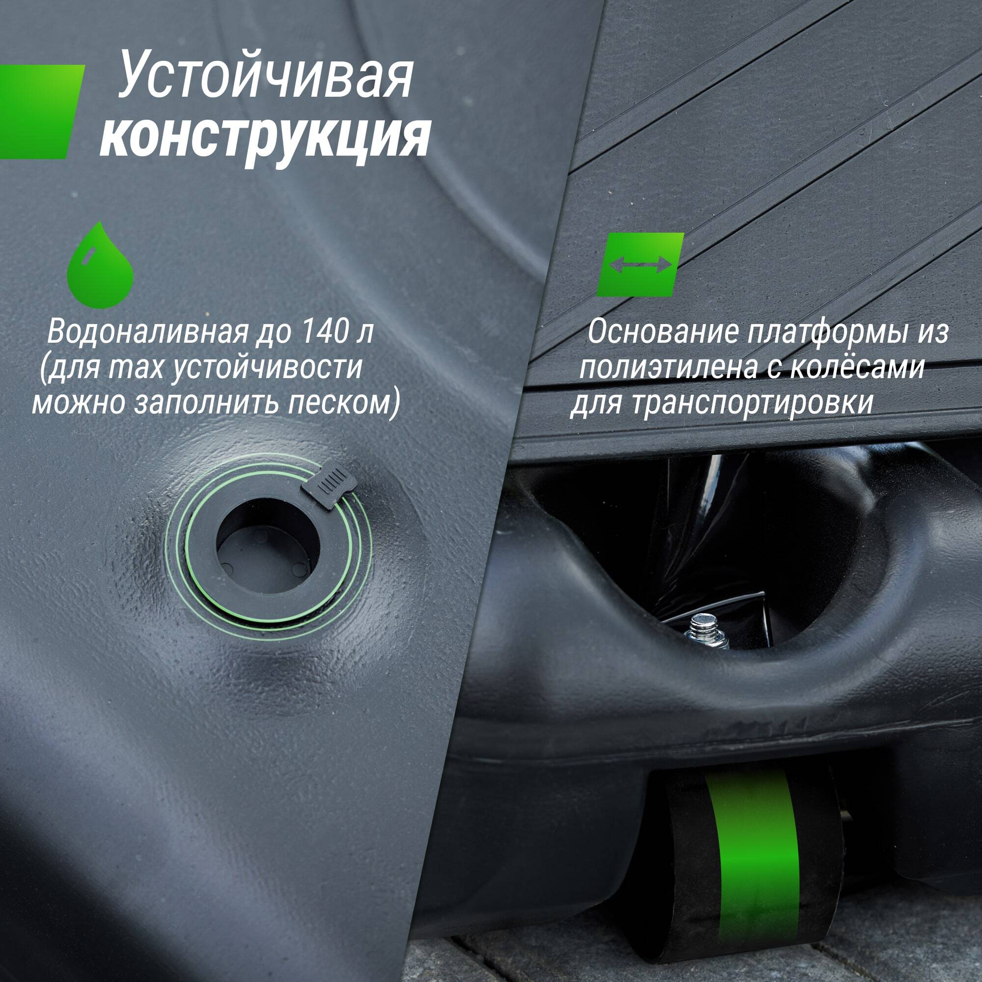 Такие высококачественные материалы уличной баскетбольной стойки 305 см как всепогодная нейлоновая сетка, щит из поликарбоната толщиной 2 мм, стальные трубы стойки и водоналивное основание платформы до 140 л гарантируют долгий срок службы, устойчивость к погодным условиям и главное - безопасность. Водоналивную платформу можно заполнить песком для большей устойчивости. Простая сборка и возможность перемещения стойки на двух колесах, обеспечат комфорт даже при подготовке к игре.