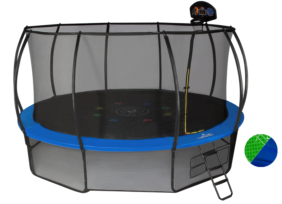 Внешний вид. Серия Air Game Basketball имеет двухсторонний защитный мат. Меняйте дизайн батута по своему усмотрению! Наслаждайтесь солнечно-зеленым цветом мата или переверните его на классический голубой.