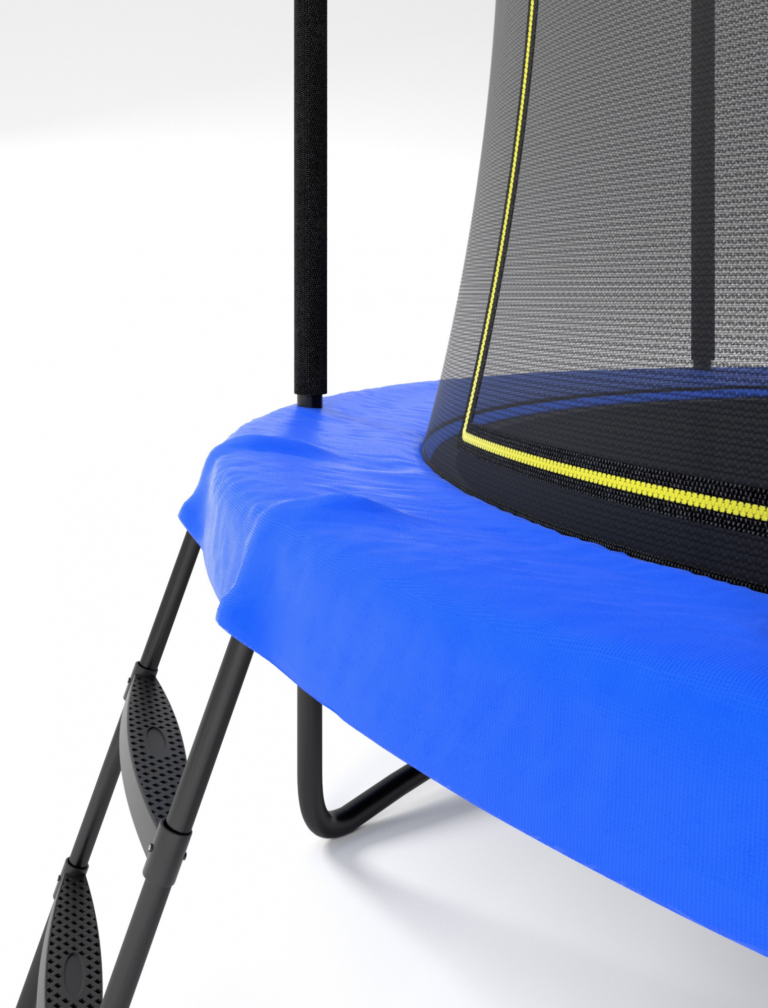 Максимальную безопасность обеспечивает защитная сетка из высокопрочного нейлона плотностью 130 гр/м², подушка безопасности толщиной 21мм и верхние стойки в мягких чехлах из поролона. В качестве материала прыжковой поверхности используется прочный перматрон. Надежные опорные стойки из оцинкованной стали с двойной порошковой окраской обеспечивают устойчивое положение батута на любом типе покрытия.