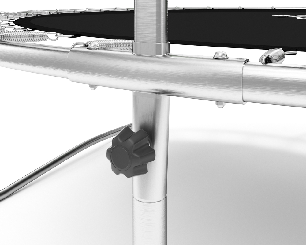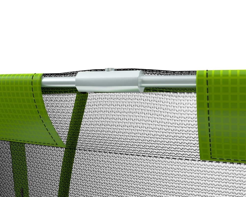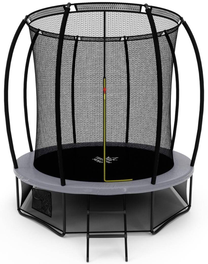 Надежные опорные стойки из оцинкованной стали с двойной порошковой окраской обеспечивают устойчивое положение батута на любом типе покрытия. Максимальную безопасность обеспечивает защитная сетка из высокопрочного нейлона, подушка безопасности толщиной 15 мм и верхние стойки в мягких чехлах из поролона. В качестве материала прыжковой поверхности используется перматрон.