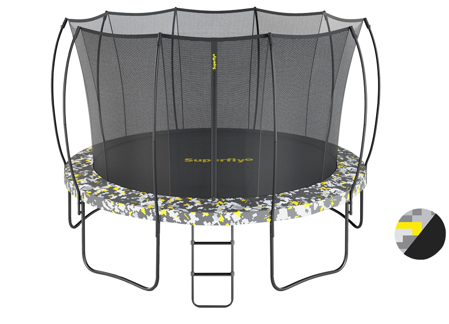 Внешний вид. Серия Superfly имеет двухсторонний защитный мат, то есть вы можете переворачивать мат и менять дизайн батута. В комплекте два цветовых решения: это Digital Como — он же цифровой камуфляж и Black classic или просто классический черный.