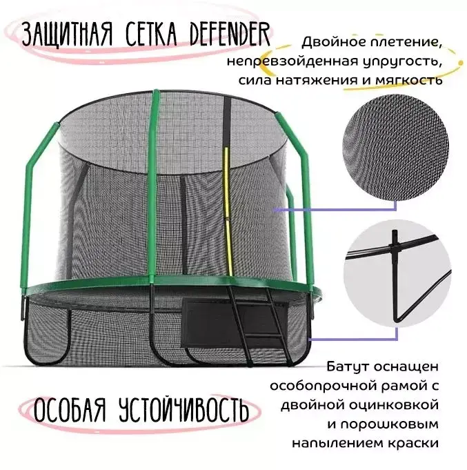 | 2 защитные сетки - верхняя сетка не даст упасть с батута, нижняя — от попадания под батут людей и животных. | |