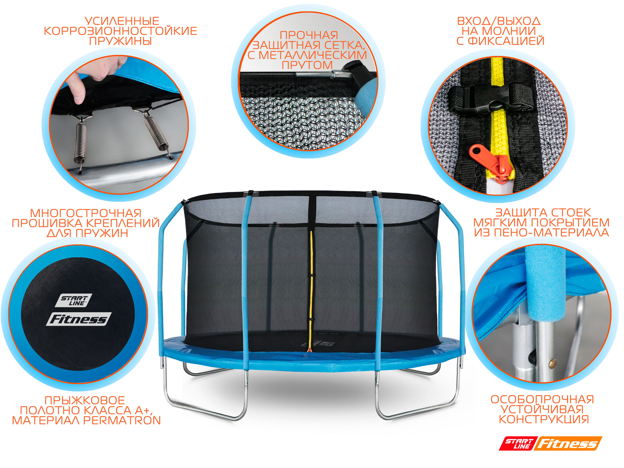 При производстве батутов уделяется особое внимание качеству. Даже на самом маленьком по диаметру батуте используется 108 пружин, это увеличивает высоту прыжка. Поверхность для прыжков выполнена из самого прочного полипропилена последнего поколения "Перматрон". Пружины выполнены из высококачественной стали, которые имеют повышенную защиту от износа и растягивания, тем самым позволяя продлить срок службы батута. Для обеспечения безопасности пружины закрыты защитным чехлом. Внутренняя защитная сетка (в комплекте) обеспечит безопасность от случайного падения. Сетка изготовлена из высокопрочного нейлона, надежно крепится к стойкам батута. Для защиты вход/выход через сетку выполнен на молнии с фиксирующими защелками с внешней стороны. В комплекте с батутом поставляются ключи для сборки и подробная инструкция.