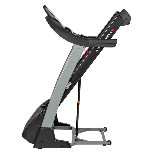 CardioPower S35 оснащен гидравлическим механизмом складывания SmartFold и транспортировочными колесами для удобного перемещения и хранения. Усиленная MFD дека толщиной 15 мм с системой эластомеров и антискользящие боковые направляющие обеспечивают безопасность тренировок, снижая ударную нагрузку на суставы и позвоночник.