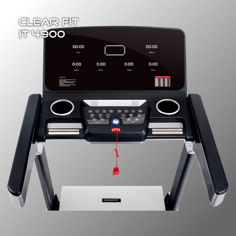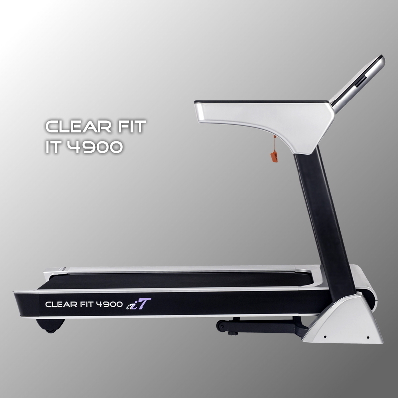 Электрическая беговая дорожка Clear Fit серии iT 4900 – мощный двигатель 3,5 л.с., разгоняющий до 20км/ч широкое полотно 490 х 1400 мм, автоматический угол наклона и усиленная конструкция в элегантном исполнении. Высокие динамические показатели и выверенная эргономика обеспечивают полную свободу движения, не ограничивая выбор тренировок и стиль спортсмена. Износостойкое полотно Diamond, надежные валы большого диаметра 50 мм, мощный мотор обеспечивают бесперебойную и тихую работу движущих элементов. Инновационная система амортизации платформы – 10 демпферов трех уровней эластичности по периметру для наиболее оптимальной и естественной защиты суставов, в передней наиболее мягкие, для принятия ударной нагрузки, универсальные в средней и более жесткие в задней части деки для толчковой ноги. Прочная ламинированная дека 18 мм и внушительная конструкция рассчитаны на вес пользователя до 140 кг., простор бегового пространства не ограничивает рост пользователя. Стандартная система складывания оборудована газовым амортизатором, для плавного самостоятельного опускания тяжелой платформы, для обеспечения безопасности как спортсмена, так и напольного покрытия помещения.