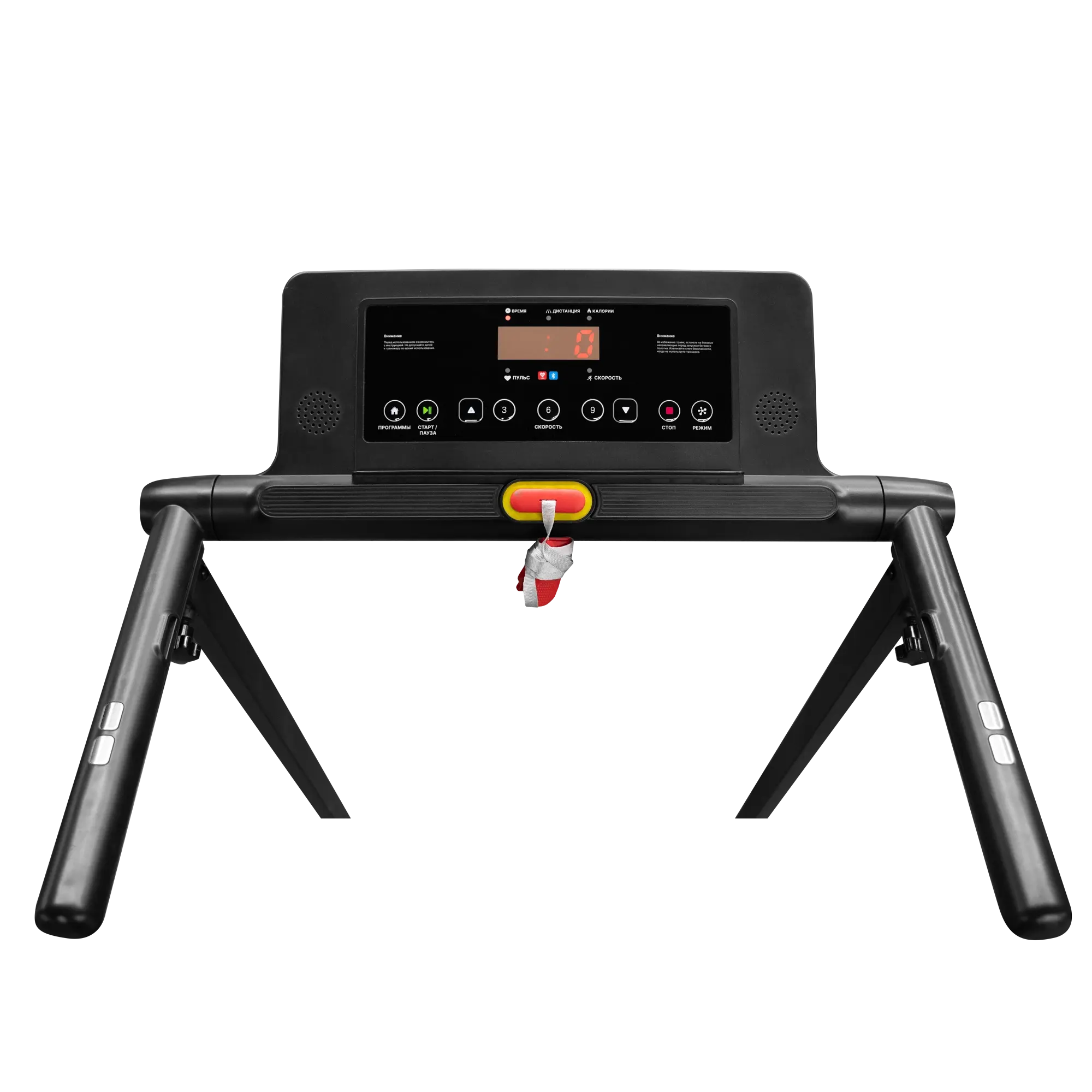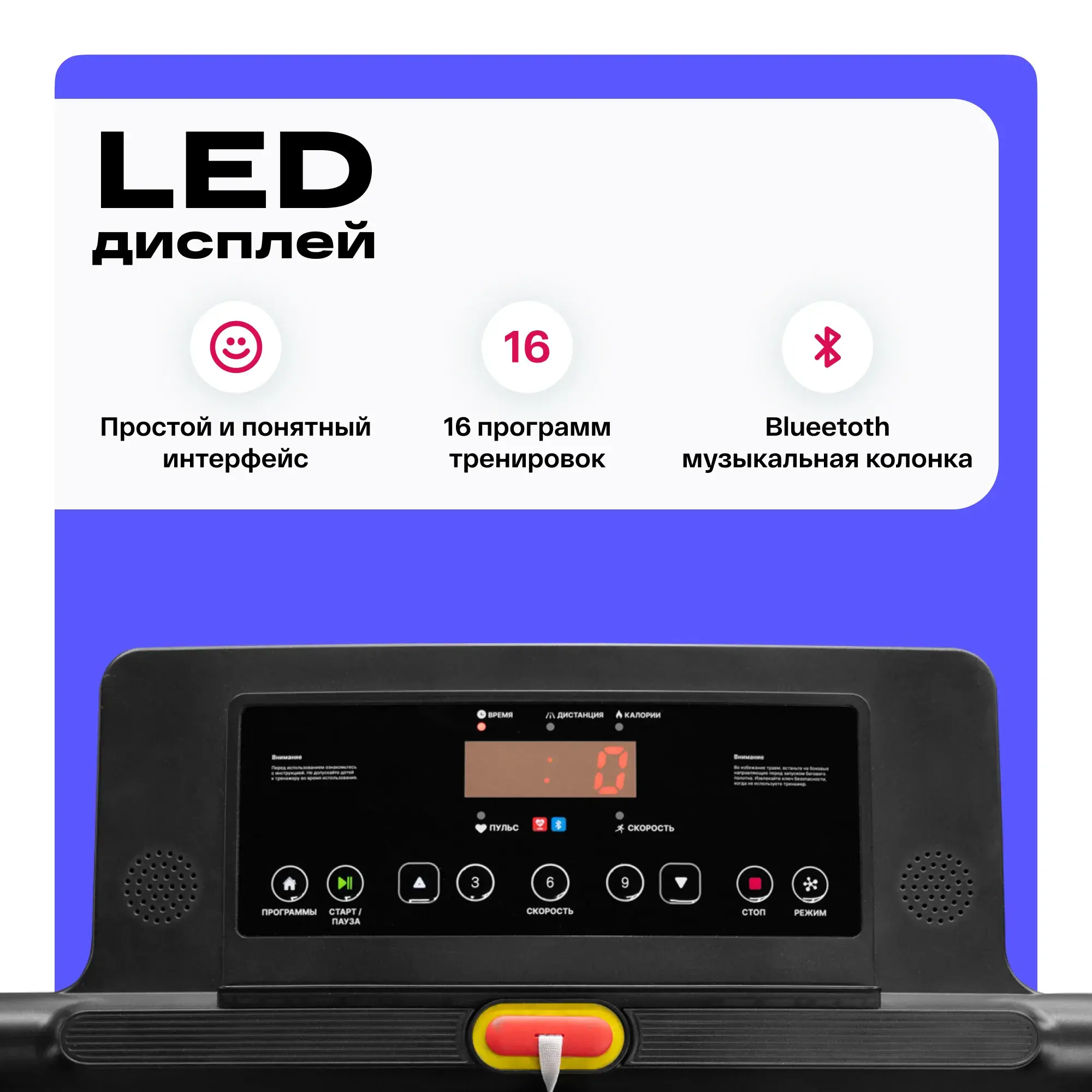 LED-дисплей консоли с понятным интерфейсом на английском языке отображает основные параметры тренировки: время, скорость, дистанцию, количество потраченных калорий и пульс.