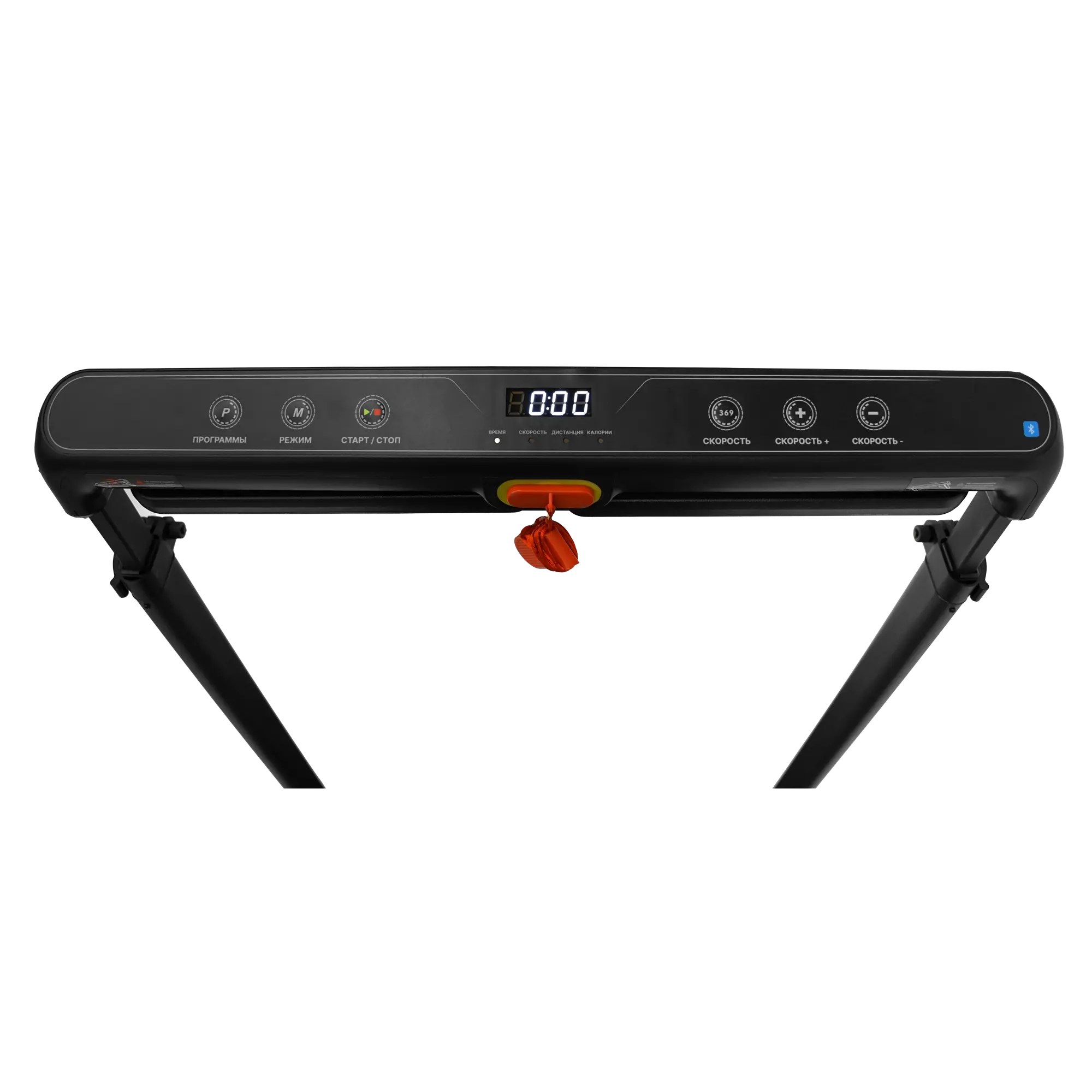 Тренажер оснащен LED-консолью с русским и английским интерфейсом, которая отображает все ключевые параметры тренировки: время, скорость, дистанцию, калории, уровень наклона и текущую программу.