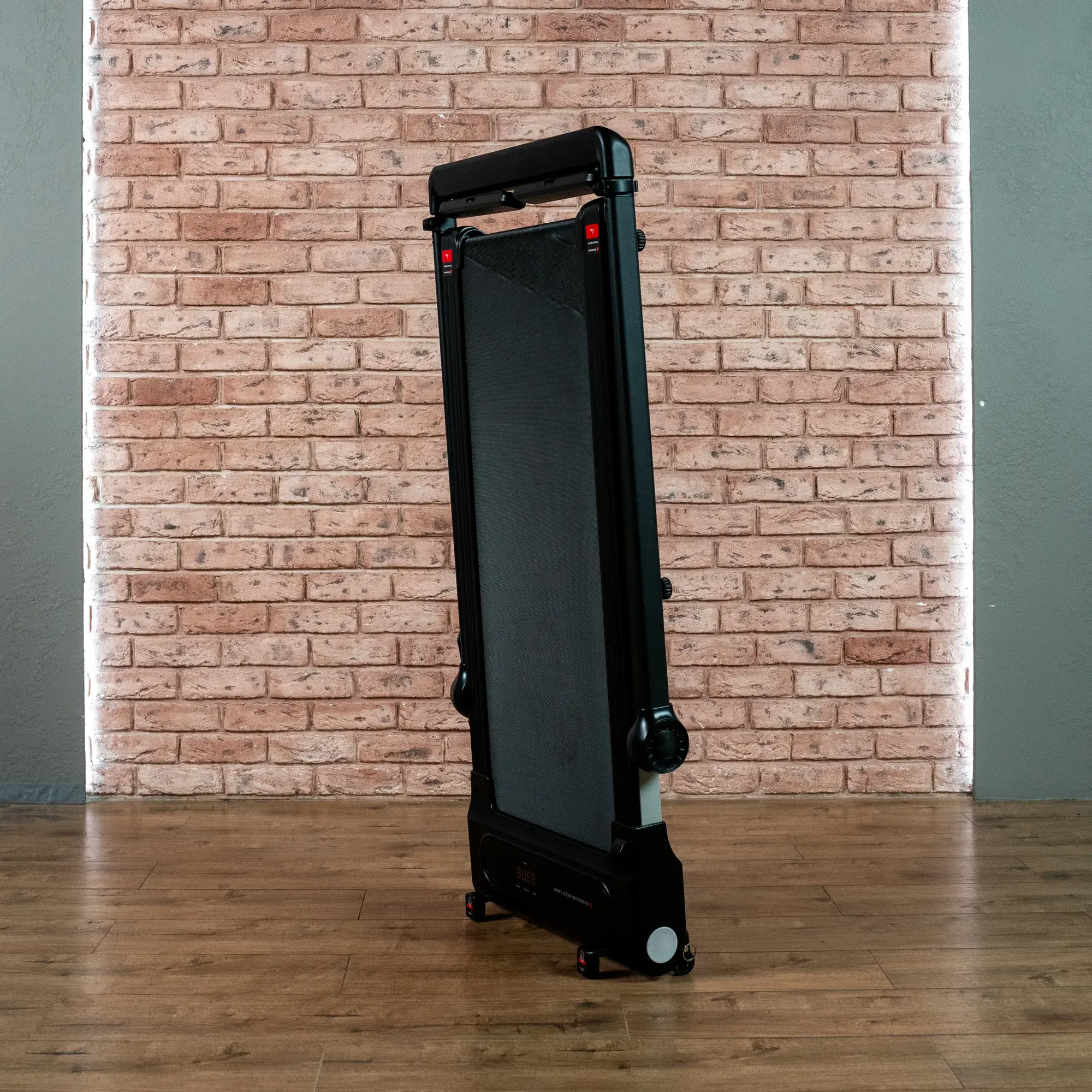 Для удобства хранения предусмотрены складывающаяся конструкция и транспортировочные ролики. В сложенном виде дорожка занимает всего 140,5 × 69 × 13 см, что делает ее удобной для хранения даже в небольших квартирах. Размеры в рабочем состоянии составляют 129,5 × 69 × 102 см.