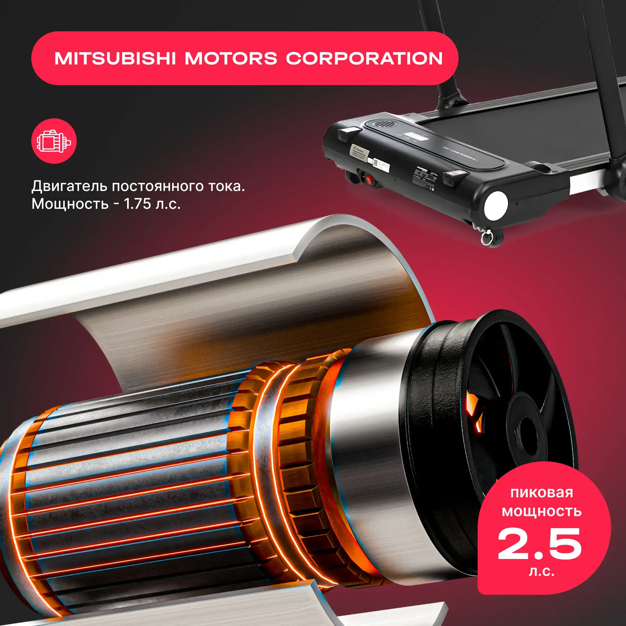 Максимально допустимая нагрузка в 110 кг и мощный двигатель Mitsubishi Motors Corporation мощностью 1,75 л.с. гарантируют стабильную и долговечную работу тренажера.
