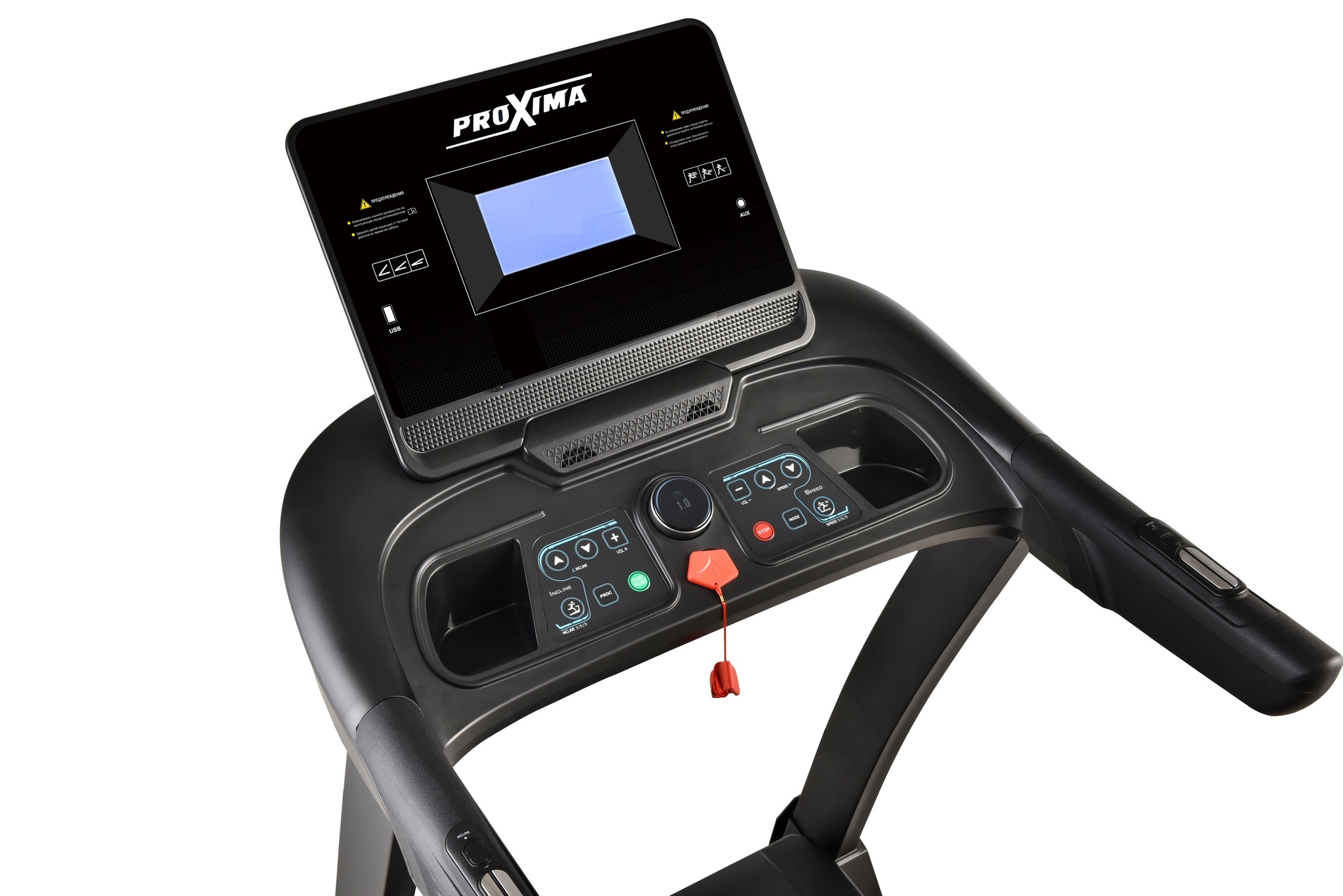 Кнопки регулировки скорости и наклона на рукоятках позволят менять нагрузку без отрыва от тренировки. Кроме тога, для изменения скорости движения полотна предусмотрен удобный эргономичный тумблер, который дублирует сигналы с большого экрана.