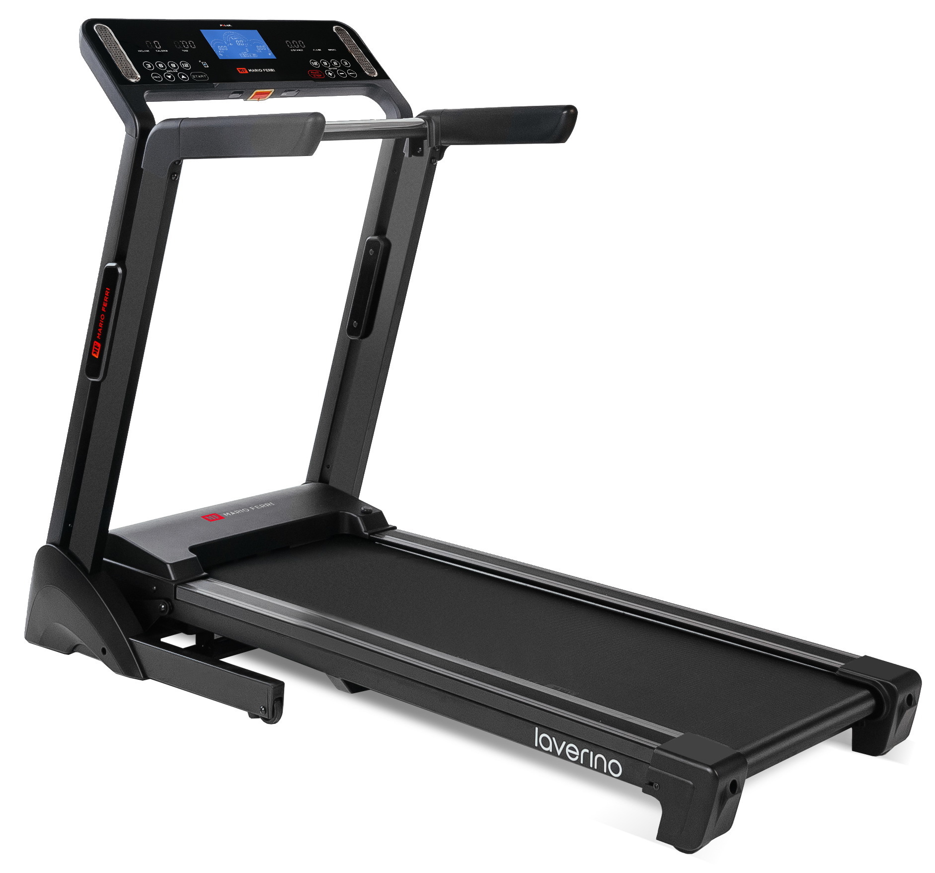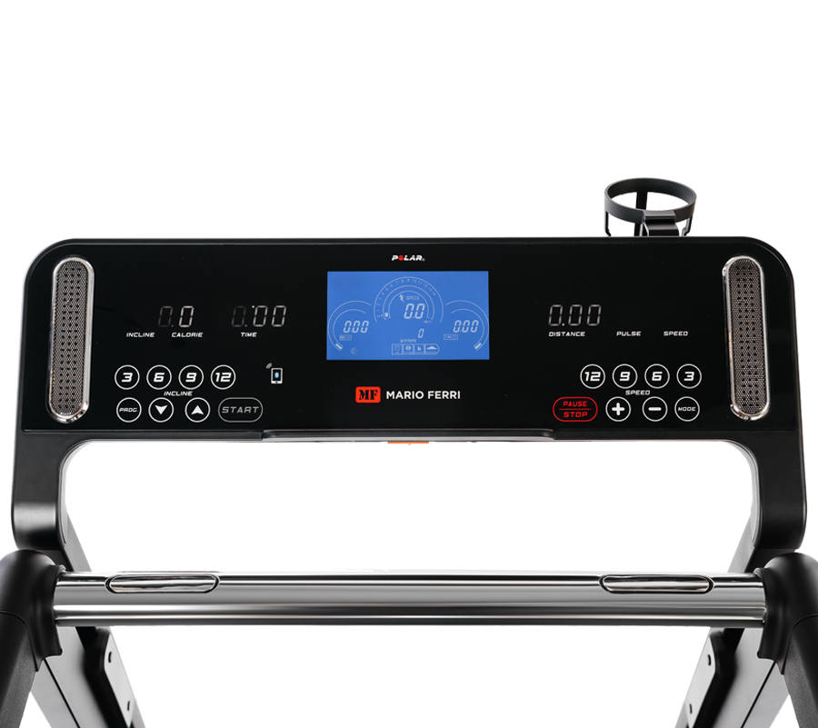 Консоль Mario Ferri Laverino представлена комбинацией из 5 дисплеев. Центральный LCD дисплей большого размера диагональю 17,5 см выводит основные параметры по принципу автомобильной консоли. Помогают ему в этом расположенные по бокам 4 LED дисплея последнего поколения. Сам тренировочный компьютер, помимо базовых значений (скорость, дистанция, расстояние, сожжённые калории, угол наклона и пройденные шаги), включает в себя 12 предустановленных программ, каждая из которых специализируется на своей задаче – снижении веса, сжигании жира, развитии выносливости, кардио и т.д. Пульс можно контролировать с помощью одной из трех пульсозависимых программ – для получения точных значений в консоль встроен беспроводной приемник пульса (оригинальный Polar). 3 пользовательские программы дают возможность создать и в дальнейшем использовать собственные тренировочные профили.