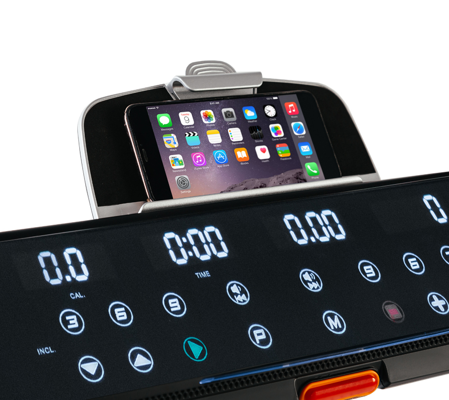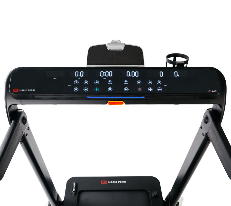 Отличительным преимуществом Mario Ferri Meggiano является информативная и технологичная консоль с сенсорными клавишами, построенная с использованием 6-ти LED дисплеев последнего поколения. Она обладает простым и понятным интерфейсом – в навигации можно разобраться за пару минут даже без знания английского. Сам компьютер, помимо базовых значений (скорость, дистанция, расстояние, сожжённые калории, угол наклона и пройденные шаги), включает в себя 18 предустановленных программ, каждая из которых специализируется на своей задаче – снижении веса, сжигании жира, развитии выносливости, кардио и т.д. Пульс можно контролировать с помощью одной из трех пульсозависимых программ – для получения точных значений в консоль встроен беспроводной приемник пульса (оригинальный Polar). 3 пользовательские программы дают возможность создать и в дальнейшем использовать собственные тренировочные профили. Мультимедийные динамики мощностью 3 Ватта воспроизводят качественный звук с подключаемого мобильного устройства либо флешки. В передней части консоли расположена подставка под смартфон или планшет, причем зарядить устройство можно прямо на месте через USB.