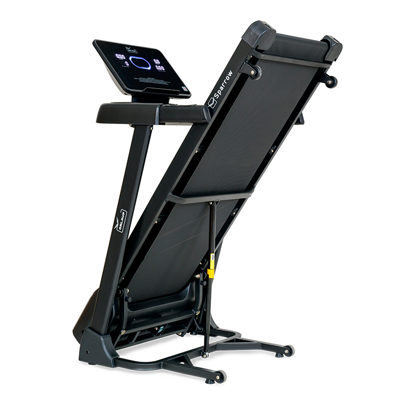 Orlauf Sparrow легко складывается вертикально с помощью газлифта, обеспечивая легкое поднятие и плавное опускание бегового полотна, что гарантирует безопасность и удобство использования.