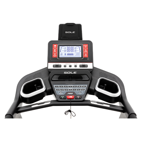 Беговая дорожка F65 оснащена охлаждающими вентиляторами и регуляторами скорости и наклона на подлокотниках для дополнительного удобства. Удобная консоль отображает скорость, наклон, время, пройденное расстояние, калории, пульс и темп и график пиков и спадов для различных программ. Встроенные динамики позволяют подключать мультимедийное устройство и воспроизводить музыку во время тренировки.