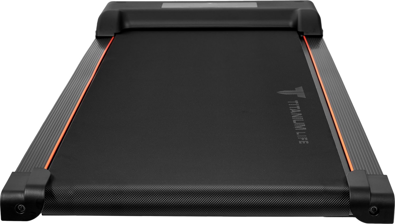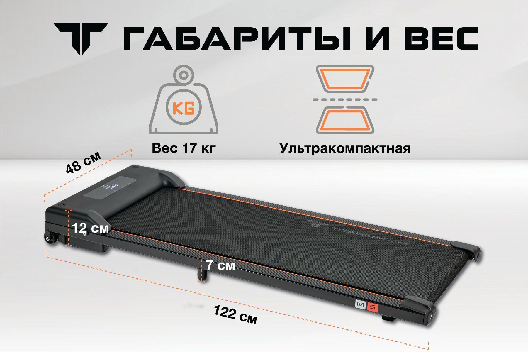 Titanium Life M5 требует минимум места для использования и хранения. В рабочем состоянии размер тренажера составляет 122 см. в длину и 48 см. в ширину – даже в самой малогабаритной квартире легко найдется место для тренировки. В сложенном виде толщина беговой дорожки составляет всего 12 см., ее можно положить под кровать или прислонить к стене в горизонтальном виде. Учитывая вес дорожки всего в 17 кг. и наличие транспортировочных роликов, переместить тренажер не составит труда даже хрупкой девушке.