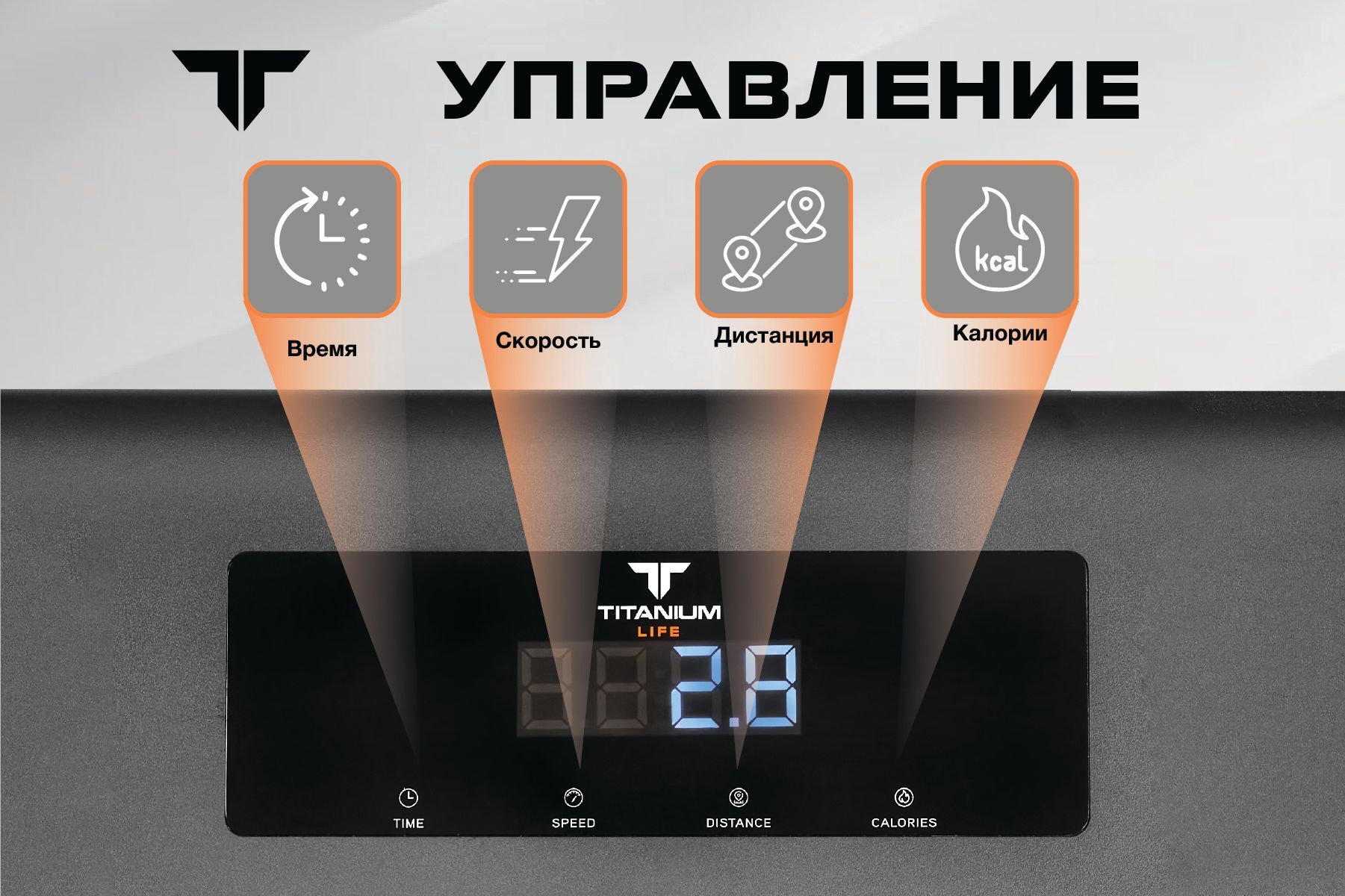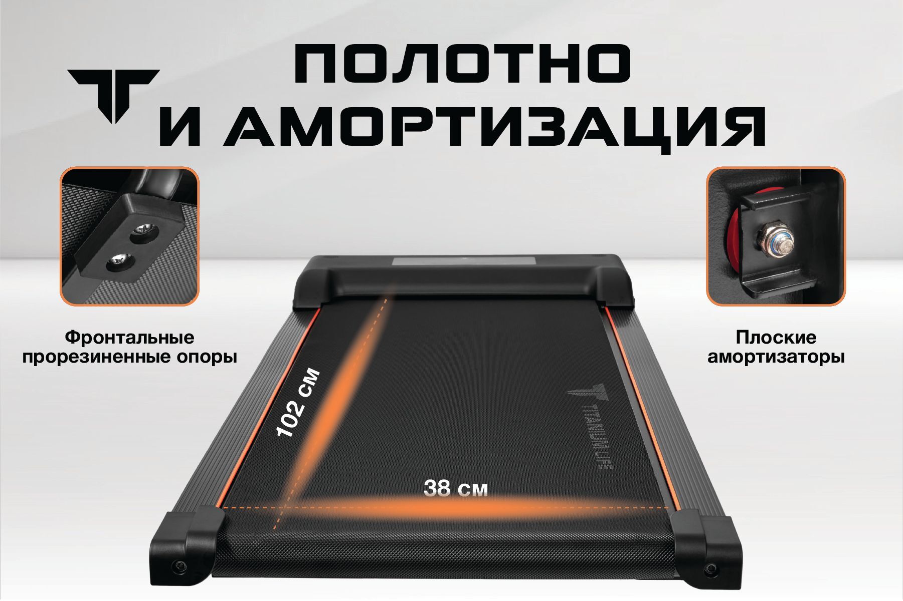 За движение отвечает надежный двигатель американской Leeson Electric мощностью 1.25 л.с. постоянного тока. Скорость регулируется в диапазоне от 1 до 8 км/ч - на максимуме этого вполне хватает для бега трусцой. Размеры бегового полотна составляют 102 см. в длину и 38 см. в ширину - этого достаточно для ходьбы и бега с небольшой скоростью. Несмотря на сравнительно небольшие размеры бегового полотна, тренироваться на Titanium Life M5 может пользователь ростом вплоть до 190 см, но есть ограничение по максимальному весу пользователя - 90 кг. Если вес превышает это значение, следует обратить внимание на модели уровнем выше. В качестве базовой амортизации здесь установлены 6 плоских амортизаторов и 2 передние прорезиненные опоры. Кроме того, дополняет демпфирующие качества парафинированная дека толщиной 1,5 см. Для создания дополнительной мягкости лучше заниматься на ковре или специально предназначенном для этого полиуретановом коврике для фитнес оборудования.