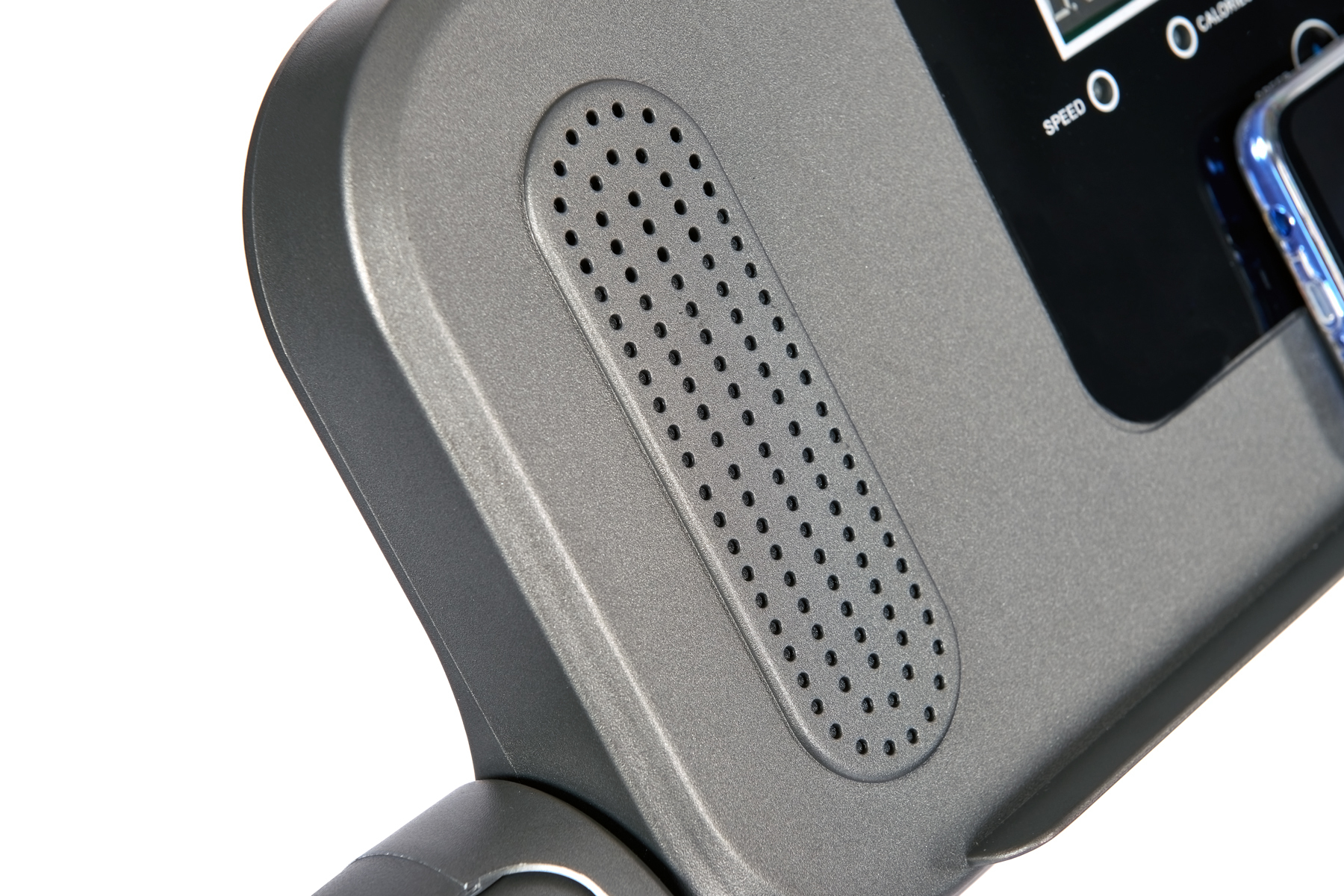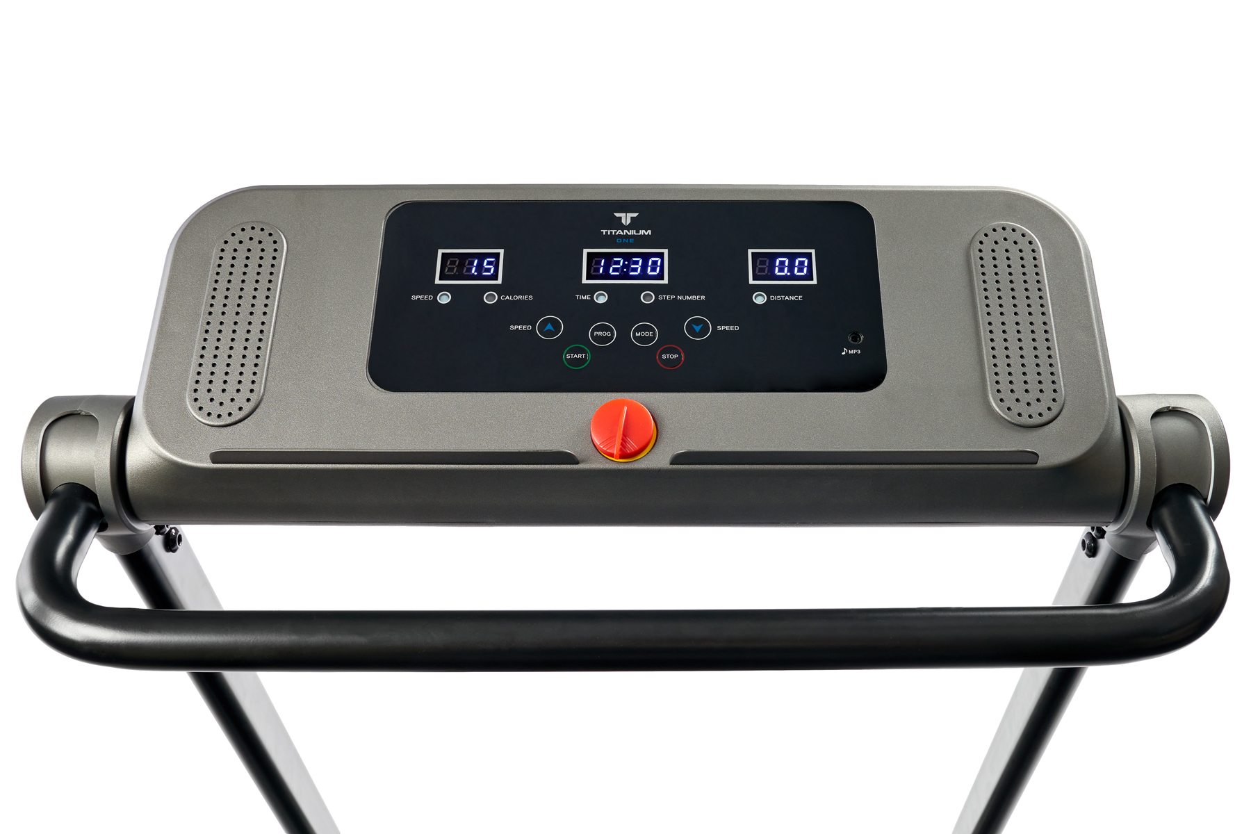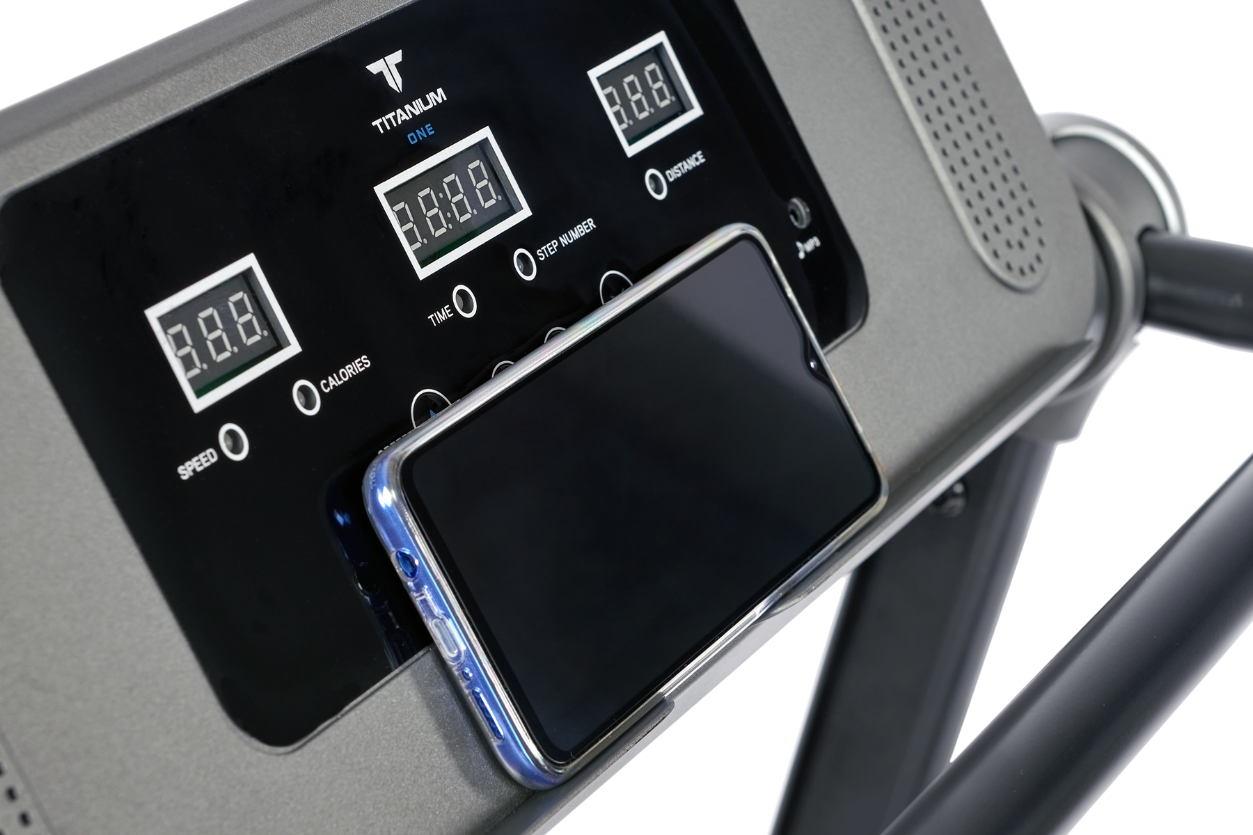 Второй аспект – информативность. Titanium One T30 SС выводит на экран тренировочного компьютера все основные параметры тренировки – время, дистанцию, скорость и сожженные калории. Можно выбрать одну из 12 предустановленных тренировочных программ либо воспользоваться одной из трех программ обратного отсчета (время, дистанция или калории). Здесь есть даже мультимедийная составляющая, на встроенные динамики можно вывести аудио файлы со своего смартфона. Небольшая, но приятная опция – подставка под телефон или смартфон. Во время тренировки можно включить фильм или сериал, это отлично помогает справиться с однообразием тренировок. Наконец, все управление происходит через консольные клавиши, постоянно держать в руках пульт нет необходимости.