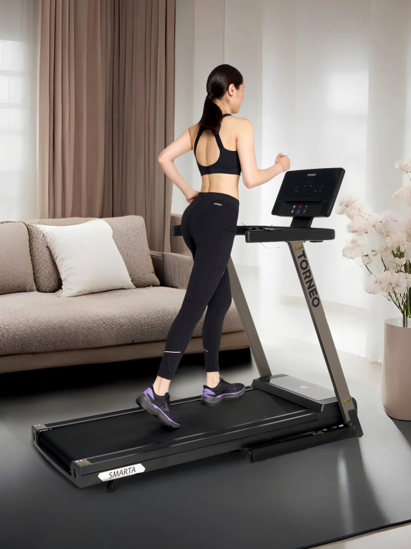 Под экраном расположена большая полка для гаджета — можно совмещать тренировку с просмотром любимых сериалов, мотивирующих роликов на YouTube или с прослушиванием музыки.
