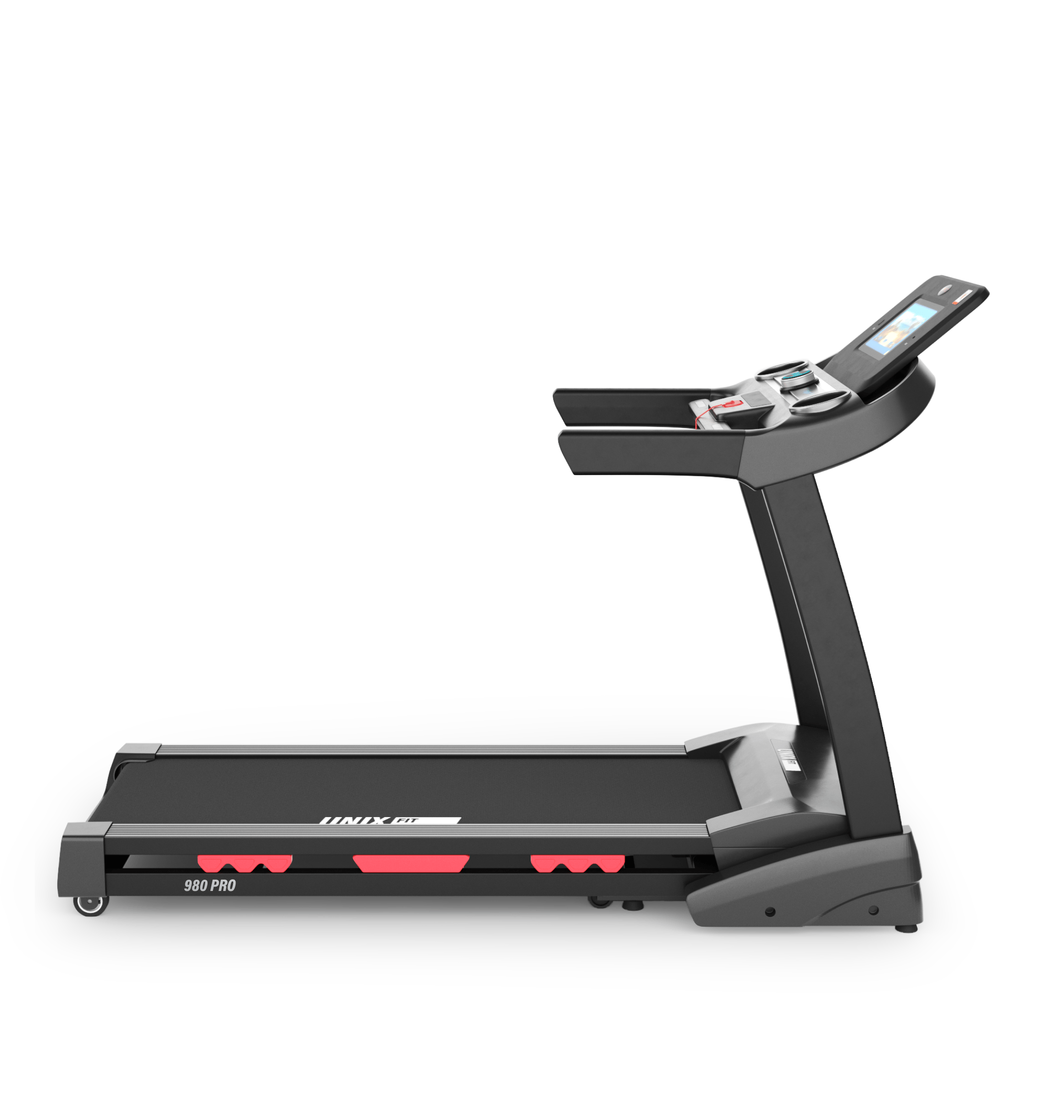 У дорожки имеется интуитивно понятная консоль управления с цветным TFT-дисплеем размером 10,1" (25 см). По центру консоли располагается кнопка включения и остановки тренировки, клавишы выбора режима и программы тренировки, а так же ползунки изменения скорости и угла наклона.