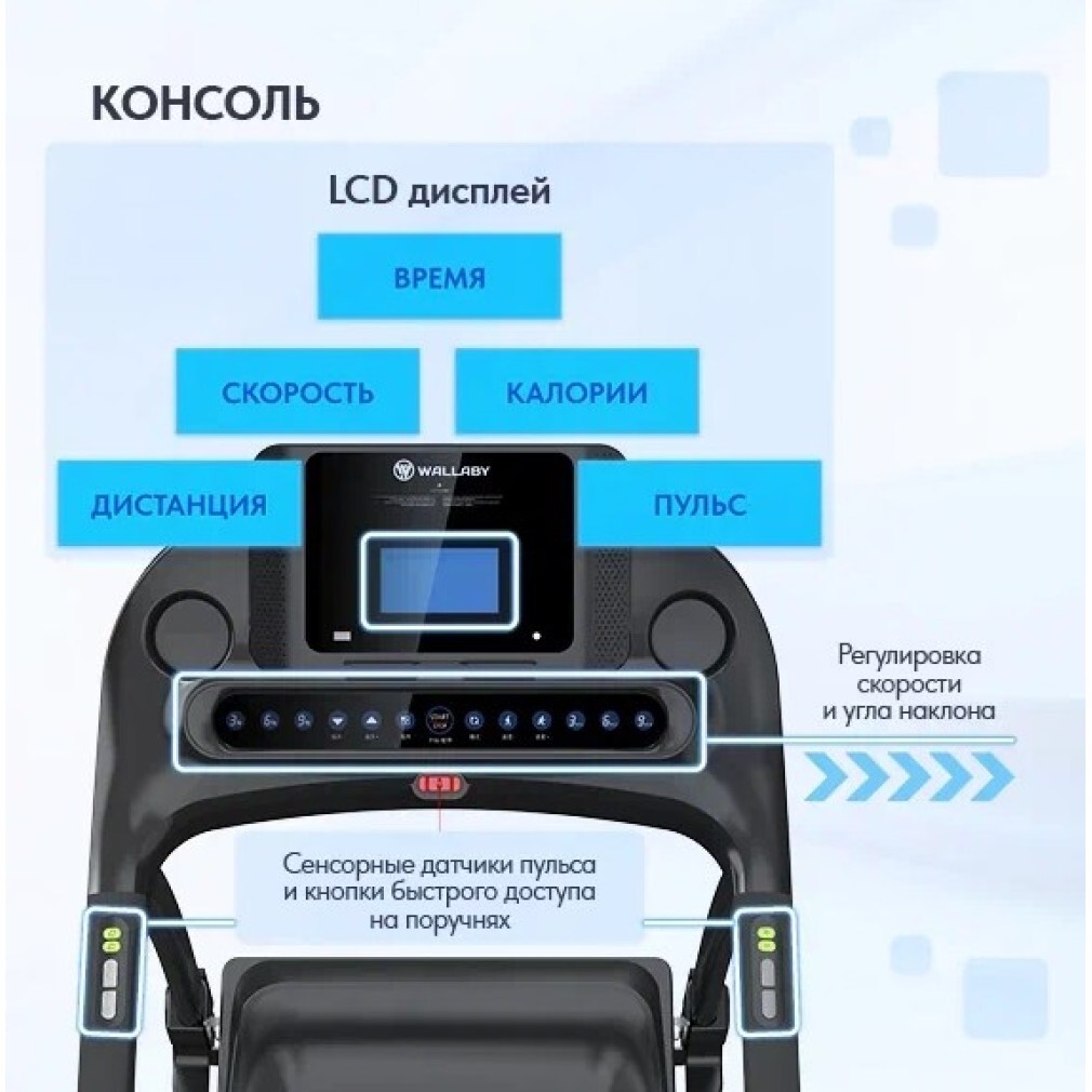 - Показания консоли: время, скорость, дистанция, калории, пульс
