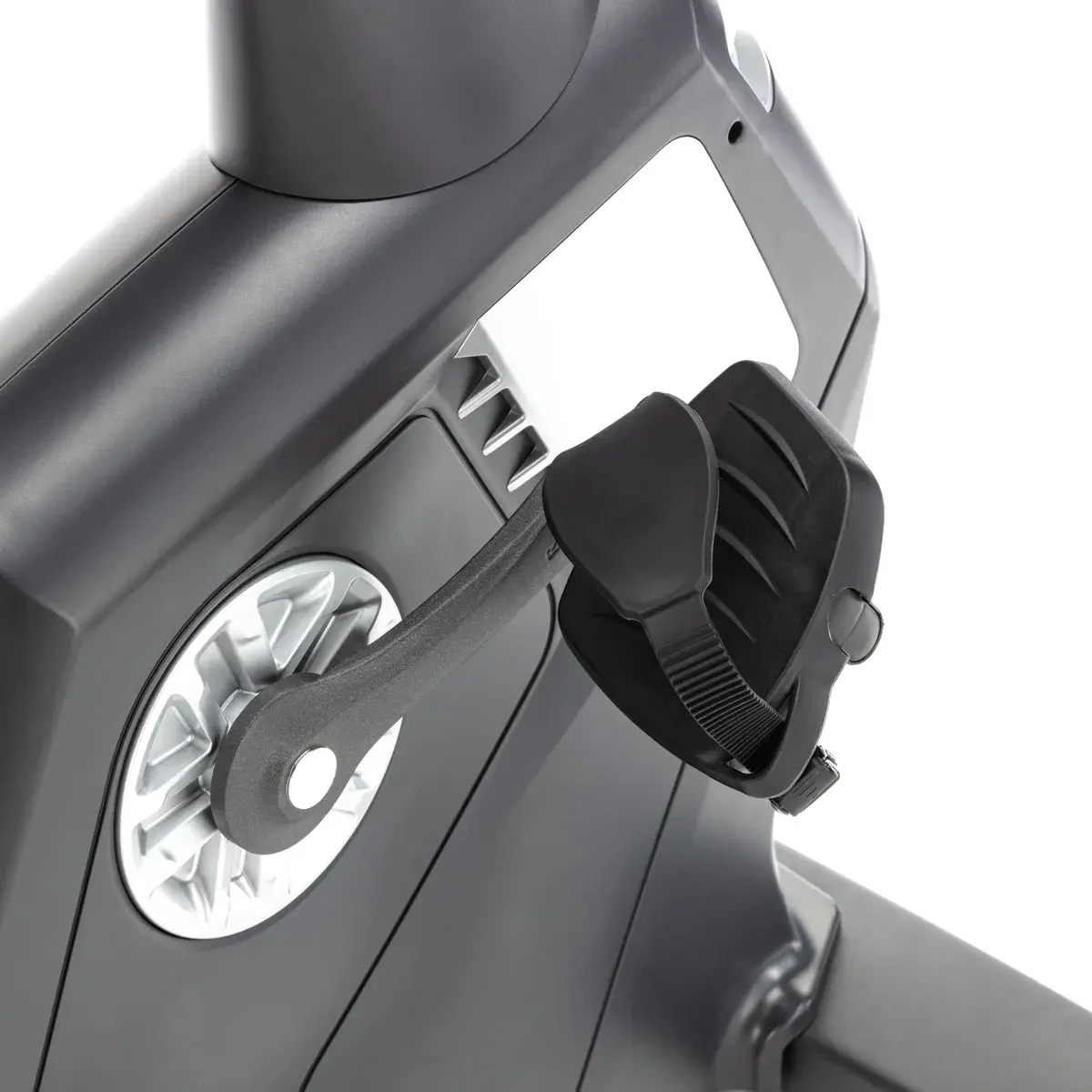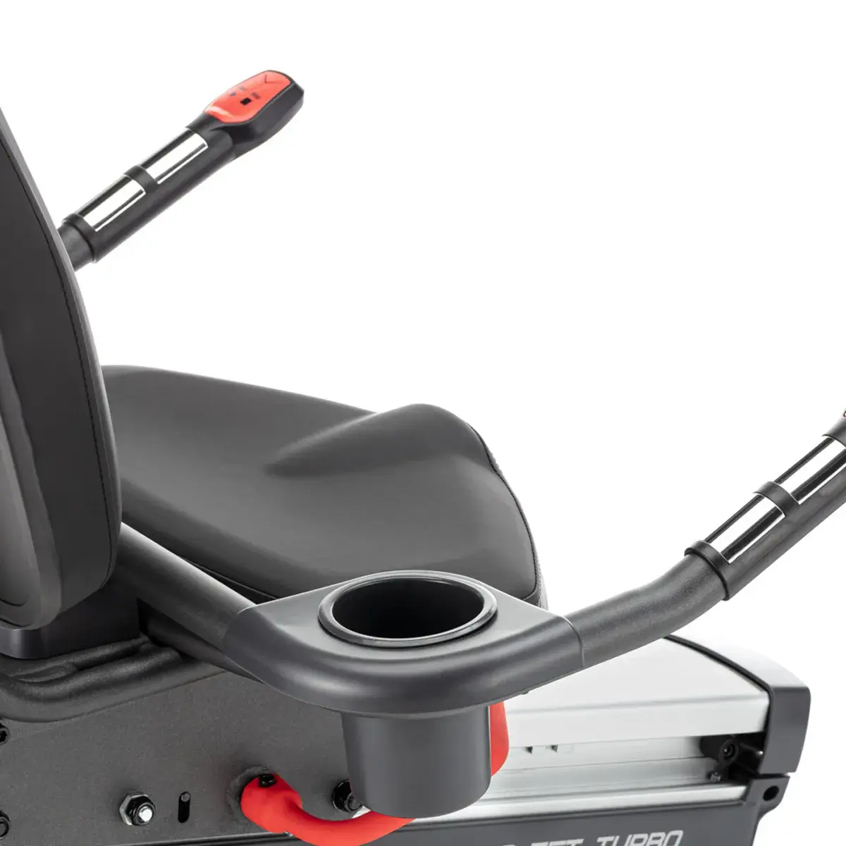 Сиденье со спинкой профессионального класса имеет возможность горизонтальной регулировки. Широкое и очень мягкое, выполненное в анатомической форме с гелевыми вставками. Направляющая рельса сиденья сделана из алюминиевого сплава. Рифленые педали с прорезиненными многопозиционными ремешками создают надежное сцепление на любых скоростях. Велоэргометр удобно перемещать благодаря двум транспортировочным роликам, а точное горизонтальное положение обеспечивают компенсаторы неровностей пола. Максимальный вес пользователя - 180 кг.