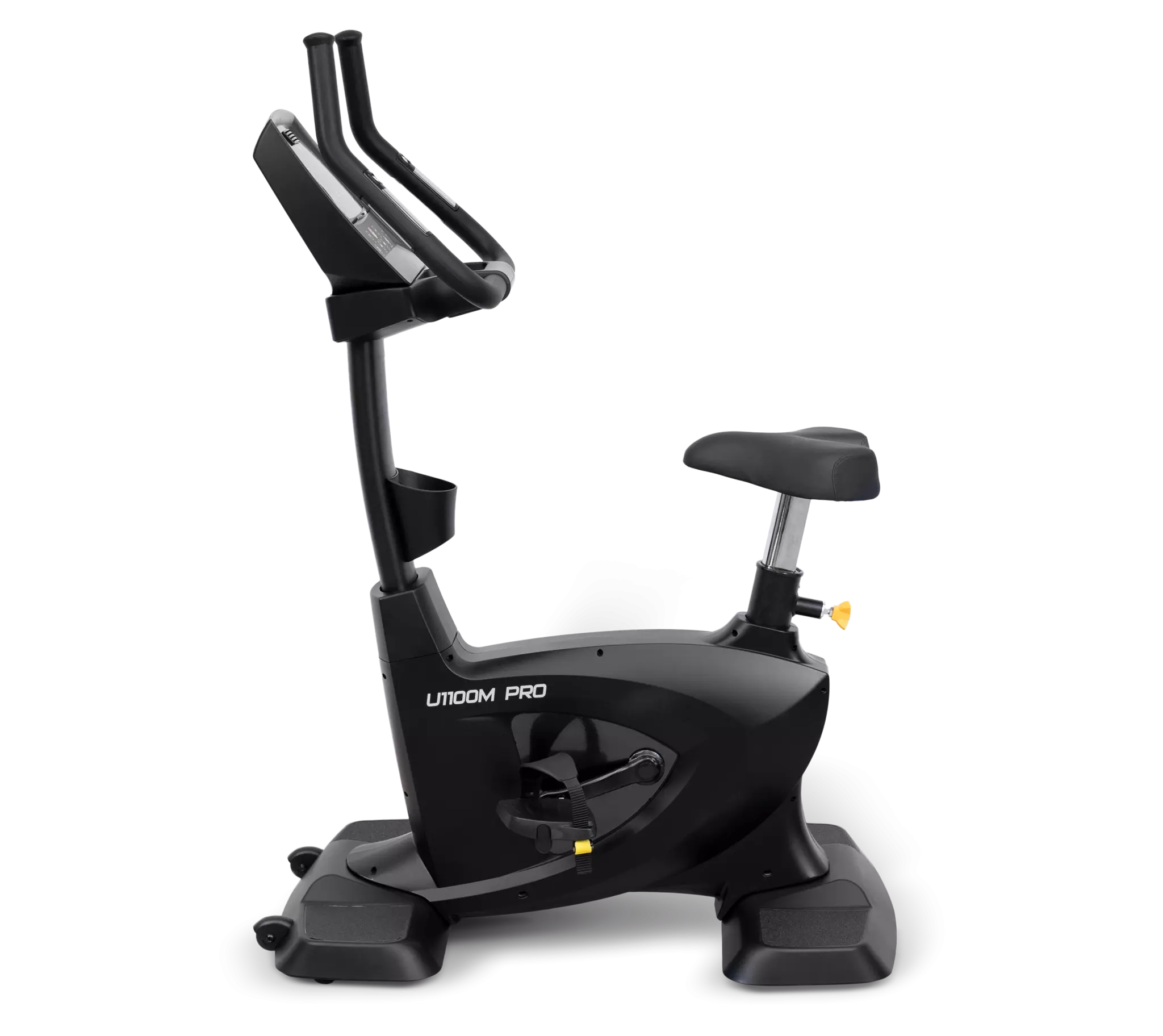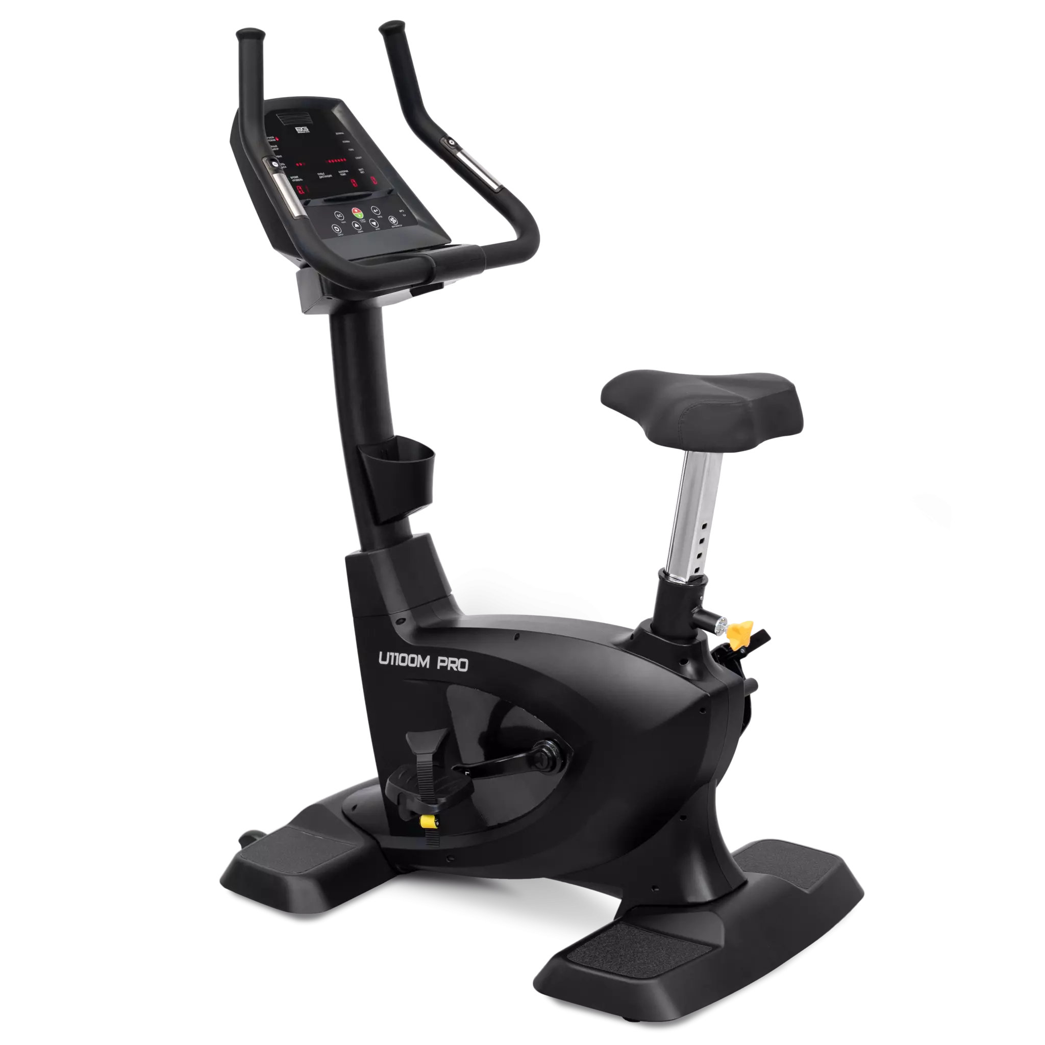 Подача идеи все та же – это крупногабаритное, мощное оборудование, рассчитанное на длительную эксплуатацию в многочасовым режиме, но в более искушенном визуальном исполнении. Серию проектировала международная команда промышленных дизайнеров, которая черпала идеи из индустрии автопрома. Дизайн-форма осталась брутальная. Мягкие и прямые линии сменились на угловатые элементы, а внешний облик кожуха маховика принял очертания треугольных форм. Таким образом, серия 1100 — это удачное сочетание тяжелого оборудования и дизайнерского продукта, модели эффектные, новаторские, спортивные и соответствует всем новейшим тенденциям. U1100M PRO – это велоэргометр с вертикальной посадкой коммерческого класса, предназначенный для использования в крупных премиальных и бюджетных фитнес клубах. Тренажер, как и подобает профессиональному уровню, оборудован лучшими техническими характеристиками. На U1100M достигнуты оптимальные биомеханические свойства. Велотренажер оснащен электромагнитной системой нагружения с генератором (GMS). В основе маховик с инерционным весом, эквивалентным 18 кг. Сиденье широкое и мягкое, регулируется по вертикали под любой рост пользователя. На базе педального узла литой трехкомпонентный шатун на подшипниках. Сами педали широкие, рассчитаны на любой размер ноги и фиксируются специальными регулируемыми ремешками. Кроме того, они покрыты специальным антискользящим рельефом. Велотренажер весьма тяжелый – 69 кг и выдерживает нагрузку до 180 кг включительно. Оборудование поставляется в упаковке из гофрированного картона. Важная часть любого коммерческого тренажера – бортовой компьютер. Он также выполнен на высшем уровне. На U1100M PRO установлено несколько дисплеев. Тренировочный прогресс отображается на основной LED-консоли. Ниже расположено 4 дополнительных маленьких дисплея, основной задачей которых является отображение показателей тренировки, куда входят: время, дистанция, уровень нагрузки, расход калорий, пульс, темп, Ватт. В памяти компьютера содержится 6 различных тренировочных режимов и 1 пульсозависимая программа. В консольную часть встроены музыкальные динамики, а также AUX IN вход для воспроизведения аудио через смартфон. Из дополнительных опций стоит отметить наличие сенсорных датчиков измерения пульса на поручнях в районе консольной части, а также быстрых клавиш регулировки нагрузки. Для бутылки с водой и личных аксессуаров установлен специальный увеличенный отсек на передней стойке тренажера. Переместить U1100M можно благодаря 2-м транспортировочным роликам.