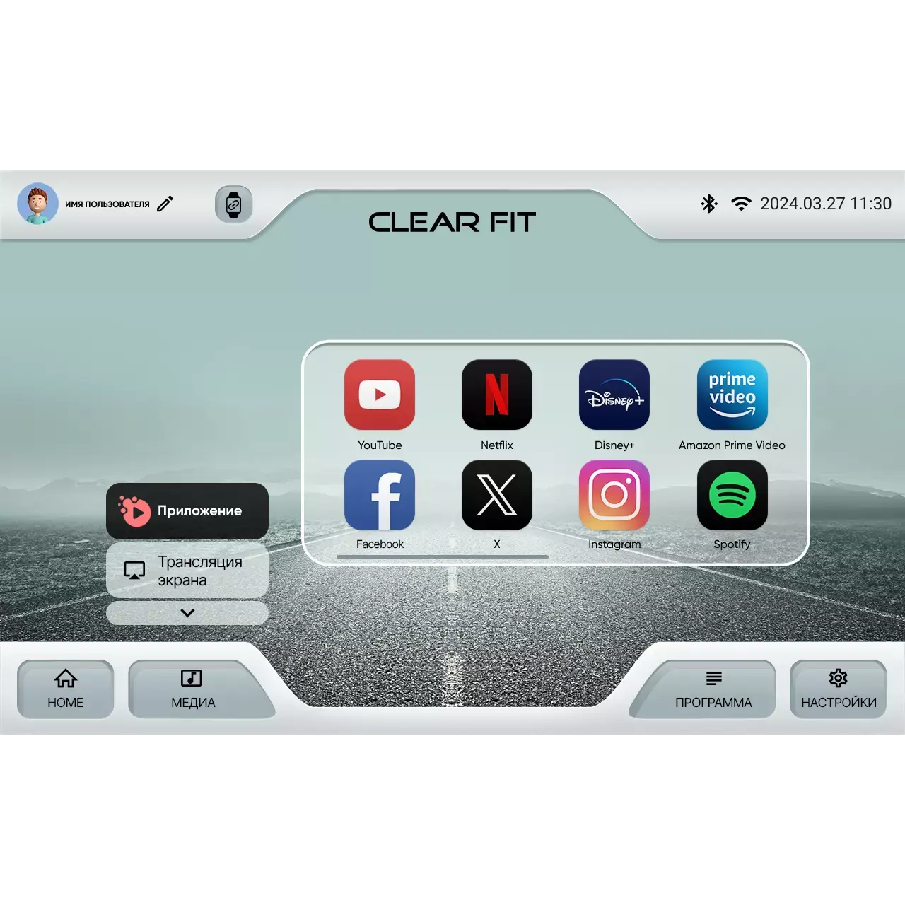 Программный пакет включает виртуальный ландшафт и целевые программы, в общей сложности 33 программы: пульсозависимые, пользовательские, предустановленные и фитнес-тест. TFT консоль подключается к сети Internet при помощи Wi-Fi соединения и оснащена встроенными приложениями: YоuТubе / Fасеbоok* / Netflix / Spotify / Prime Video / Instаgrаm* / Disney+. Воспроизведение музыки возможно при помощи Jack 3.5 мм и при помощи Bluetooth подключения. Вывод аудио сигналов осуществляется при помощи встроенных колонок, проводных и беспроводных наушников.