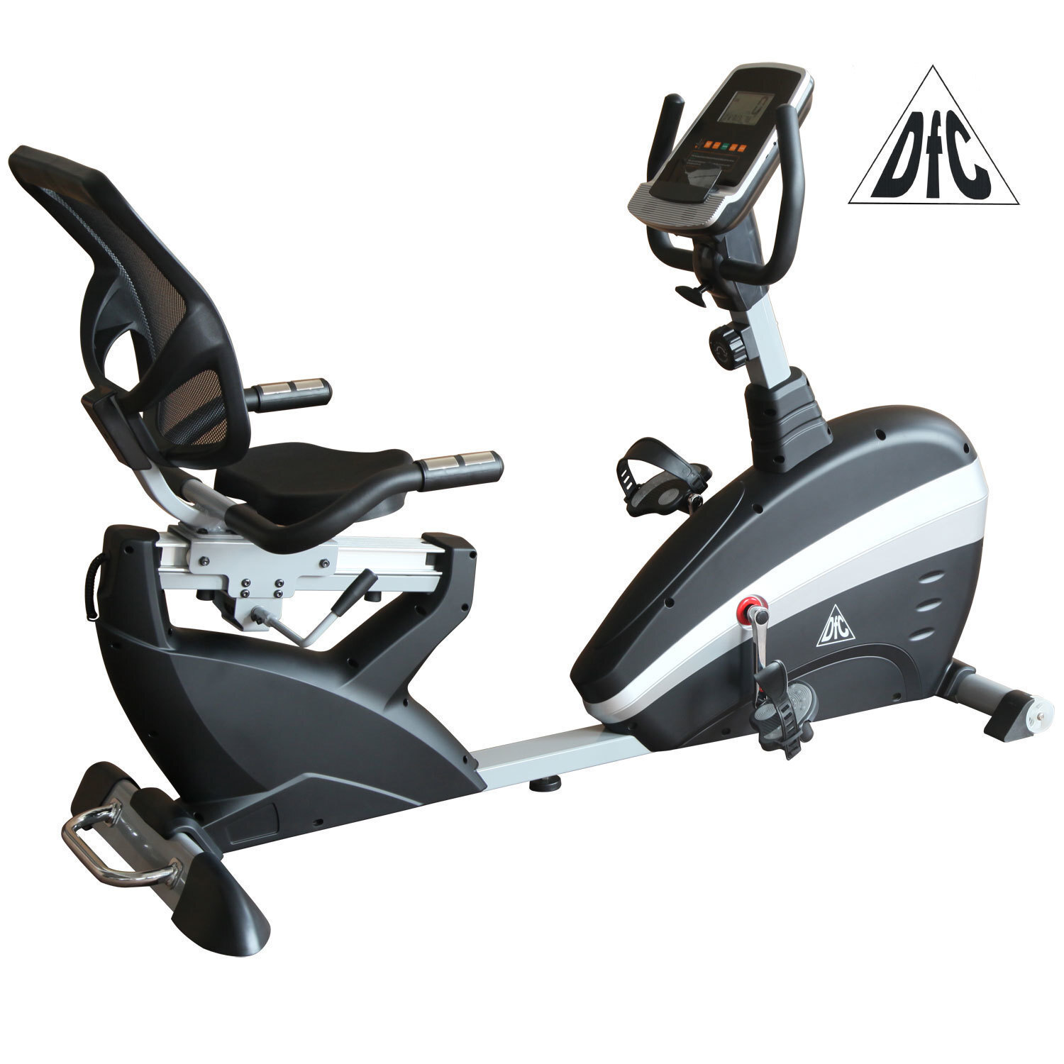 Электромагнитный велотренажер DFC B8715R горизонтальный оборудован сиденьем анатомического типа, которое также вентилирует спину. На ручках установлены датчики, позволяющие отслеживать частоту пульса непосредственно во время занятия. Педали имеют рифленое покрытие, а также ремешки, чтобы нога не проскальзывала. Конструкция оборудована подставкой для планшета. Максимальный вес спортсмена не должен быть 130 кг. Тренажер оснащен дисплеем, на который выводится вся информация, касающаяся тренировочного процесса: скорость движения, время и потерянные калории.
