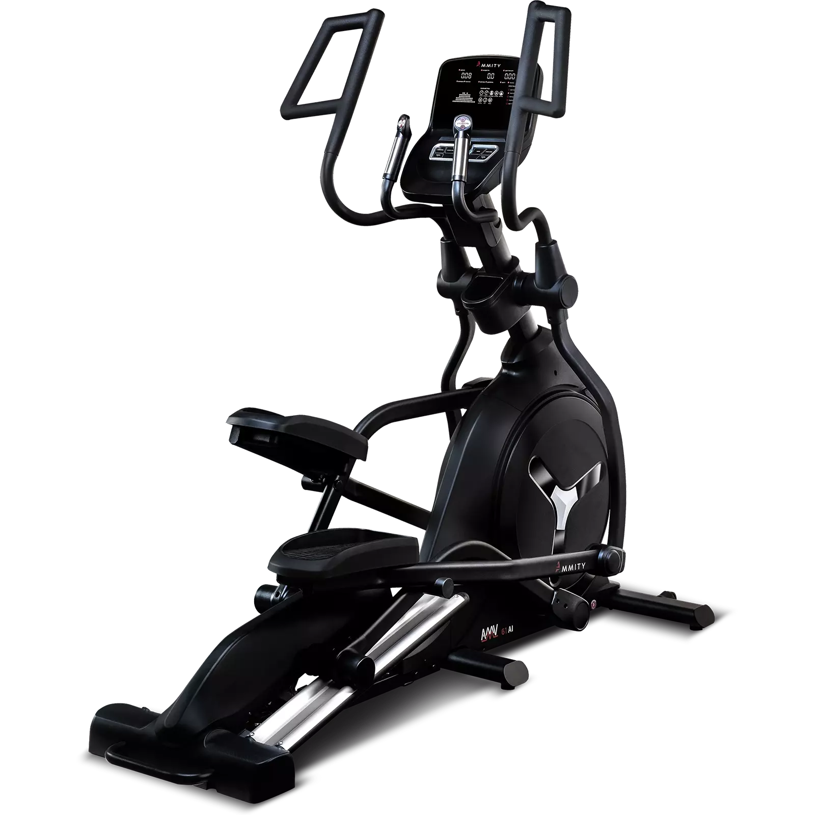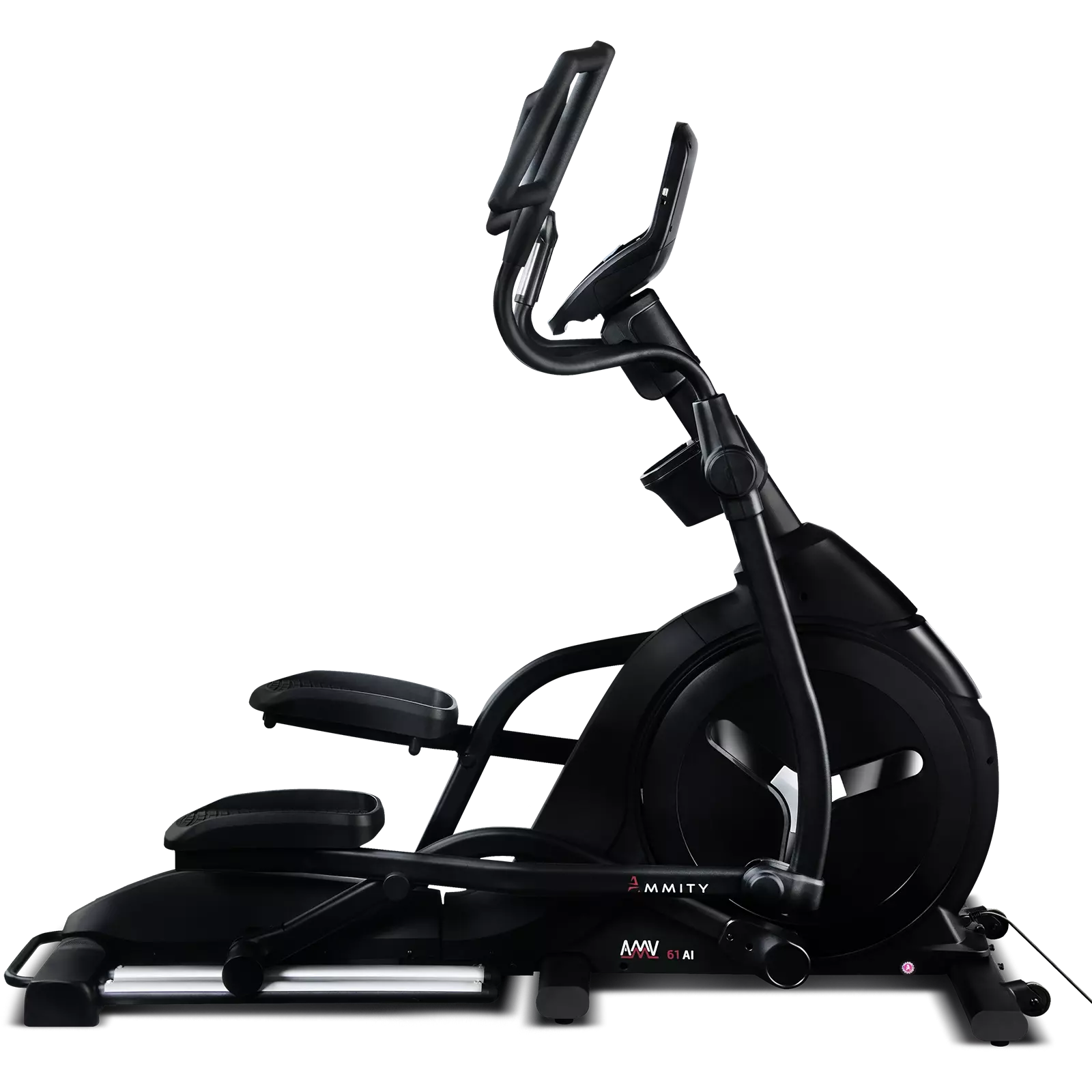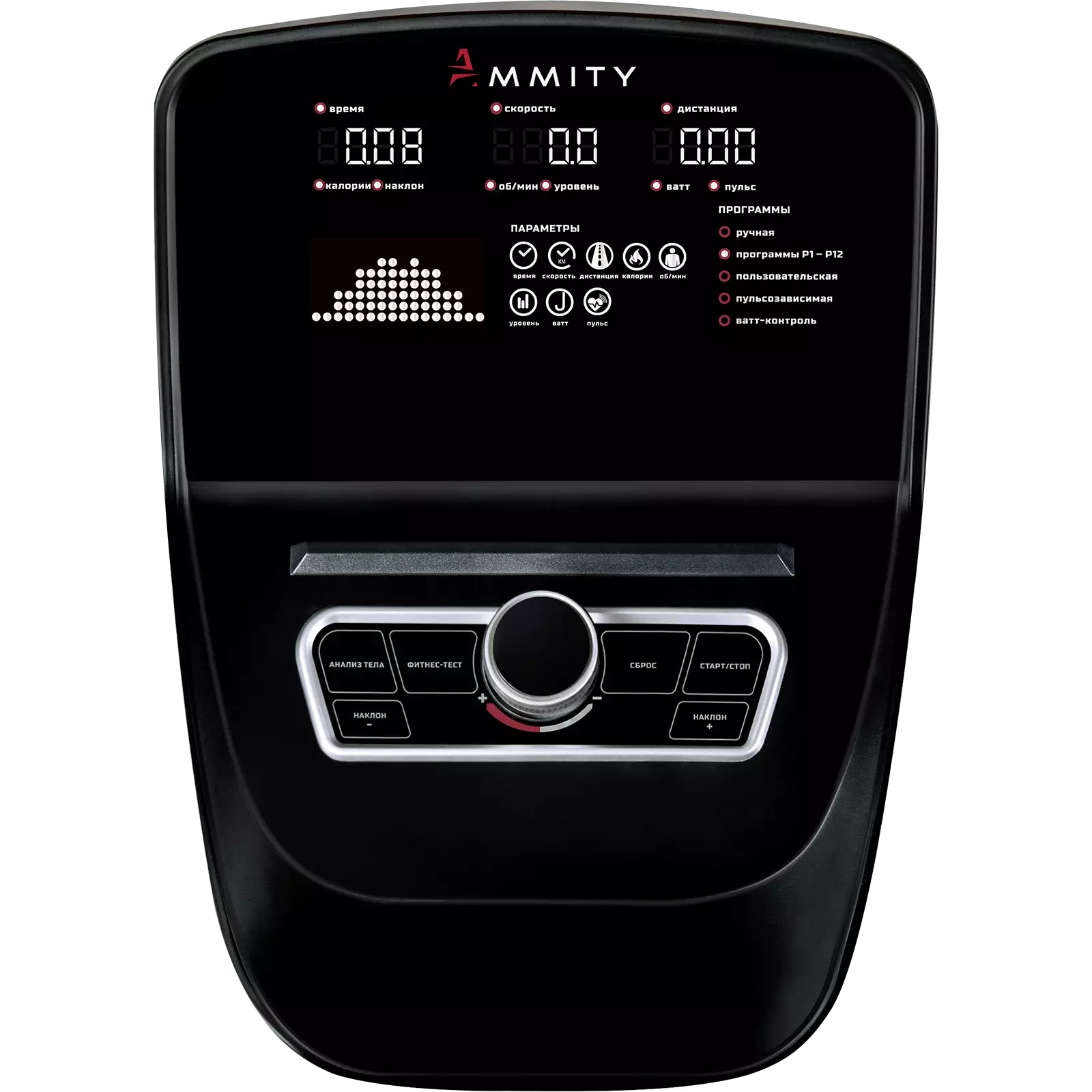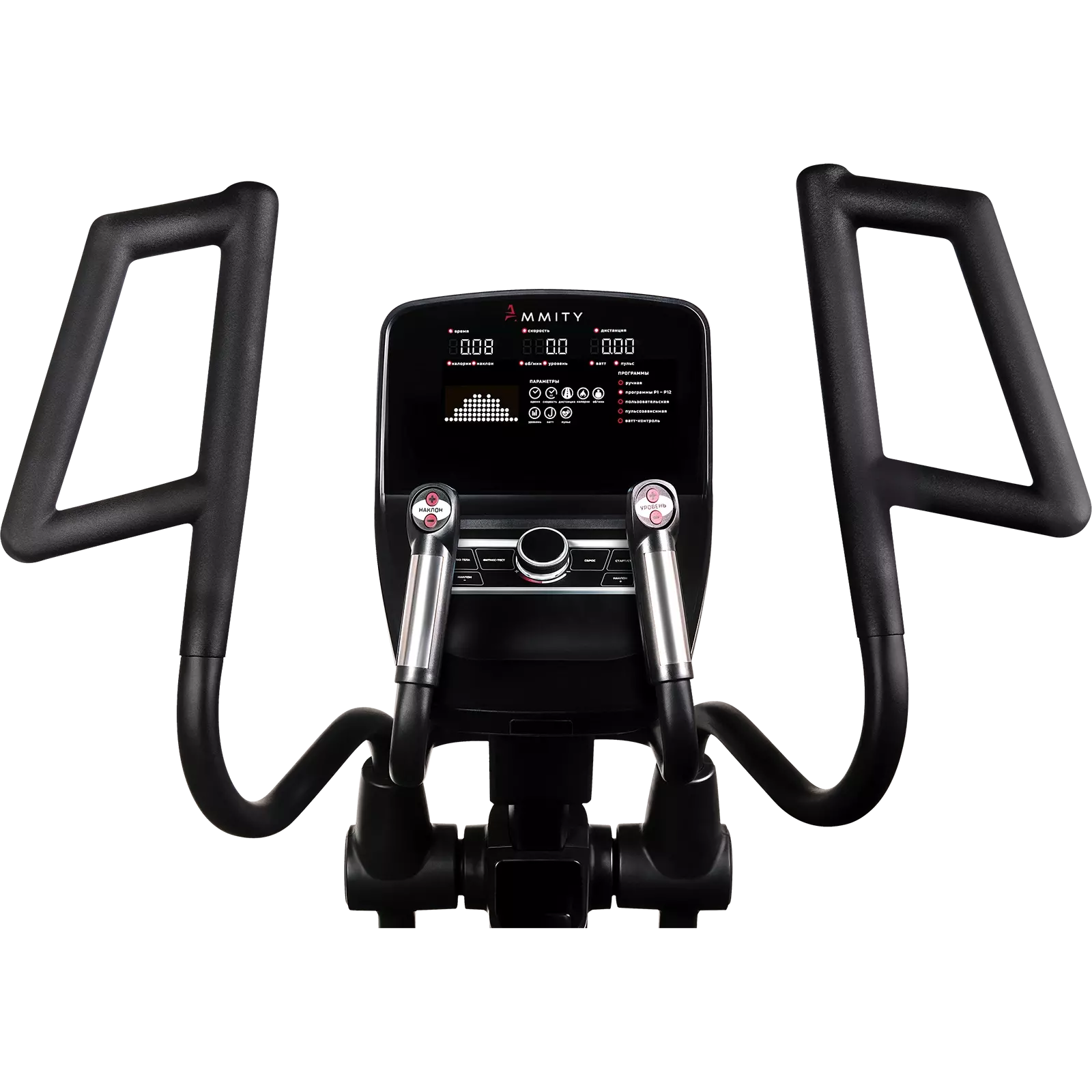AMMITY AMMV 61 AI — это мощный крупногабаритный эллиптический эргометр с электрическим изменением наклона рампы, для регулярных и интенсивных тренировок профессионального уровня. Идеальная эргономика тренажера, мощная рама и профессиональная длина шага создают наиболее естественную биомеханику движения. Эффективная и безопасная траектория вращения характеризуется большой длиной шага при малой высоте, эти параметры варьируются в диапазонах 610 / 613 / 614 / 617 / 619 / 621 / 623 / 626 / 628 / 630 мм и 220 / 223 / 227 / 230 / 233 / 237 / 240 / 243 / 247 / 250 мм соответственно, при изменении высоты наклона рампы. Вытянутая траектория движения акцентирует нагрузку на мышцы ног и ягодиц, бережет суставы, создает наиболее комфортные условия тренировки. Расстояние между педалями: Q-фактор равен 40 мм, что соответствует наиболее правильной и удобной постановке стоп во время движения, снижая излишнюю нагрузку на суставы. Эргономичные мультипозиционные поручни и мощный трек обеспечивают правильное положение спортсмена, позволяя задействовать в тренировке максимальную группу мышц спины и верхнего плечевого пояса, без нагрузки на позвоночник. Уникальный плавный ход тренажера достигнут за счет использования профессиональной системы привода iRONPRO™ и высококачественных впрессованных подшипников центральной оси. Сбалансированный тяжелый маховик, магнитная система сопротивления и профессиональные комплектующие привода обеспечивают равномерную нагрузку на всем цикле вращения. Надежная мощная рама, двойной алюминиевый трек и профессиональная система привода допускают интенсивные тренировки пользователям до 180 кг. Высококлассная эргономика конструкции обеспечивает комфорт и правильное положение спортсмена во время тренировки в широком диапазоне роста от 160 до 215 см.