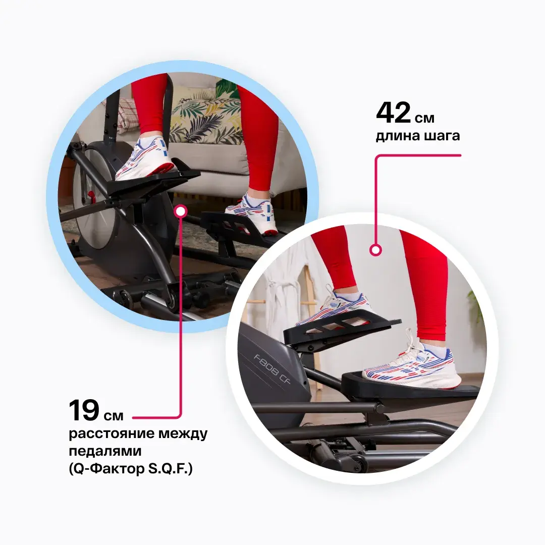 Длина шага для CARBON FITNESS F808 CF составляет 42 см., а расстояние между педалями (так называемый "малый Q-Фактор S.Q.F.™") - 19 см.