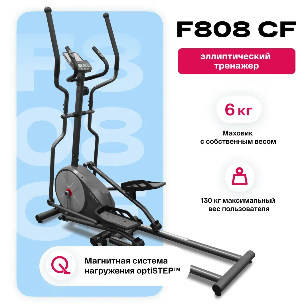 F808 CF имеет складную конструкцию, которая позволяет существенно уменьшить площадь хранения. Магнитная система нагружения по технологии optiSTEP™ обеспечивает биомеханически правильное педалирование и корректное распределение нагрузки по всей траектории движения.