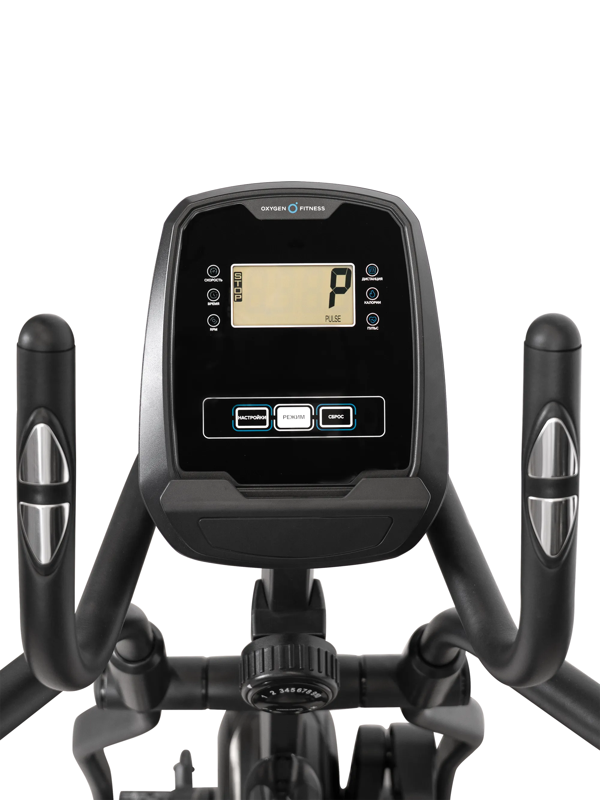 Доступные режимы: быстрый старт и ручной режим. Интерфейс поддерживает русский и английский языки. Для контроля сердечного ритма предусмотрены сенсорные датчики пульса на поручнях. Рукоятки двухпозиционные, с нескользящим покрытием.