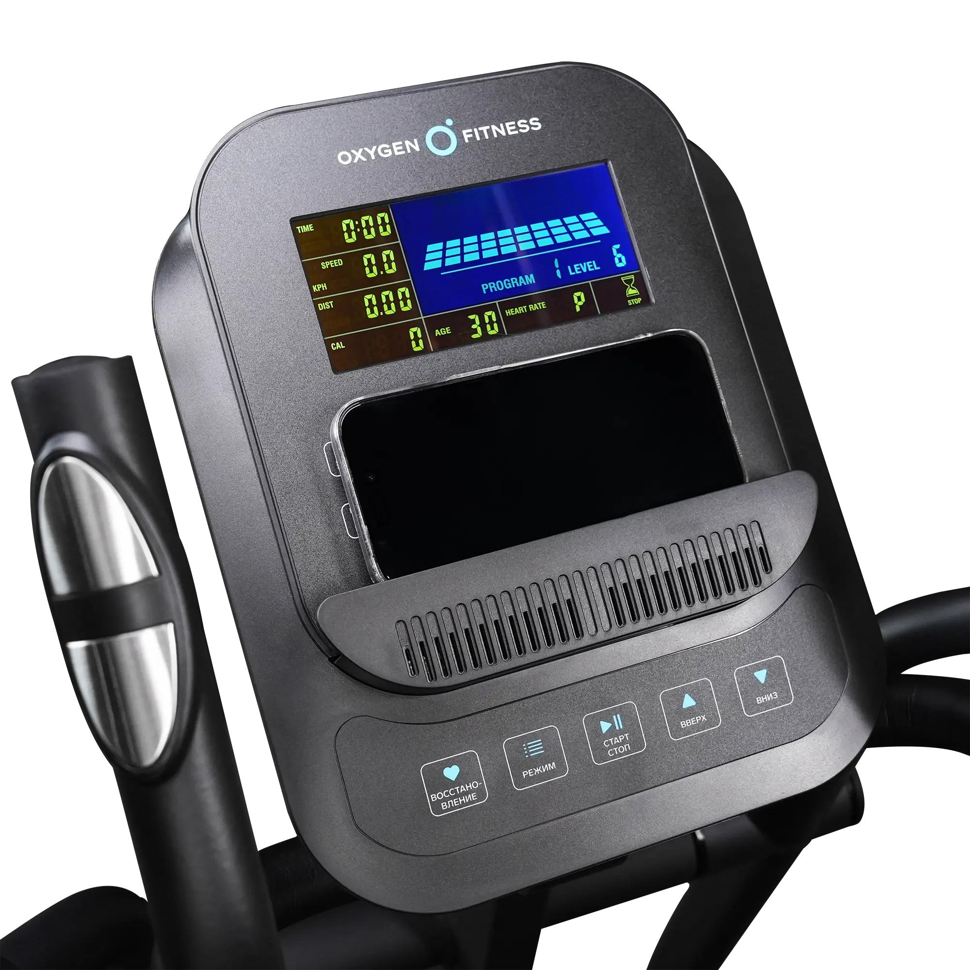 Консоль OXYGEN FITNESS IDAHO оснащена LCD дисплеем с подсветкой, который отображает все ключевые параметры тренировки: время, скорость, дистанцию, калории, пульс, уровень нагрузки, выбранную программу и статус Bluetooth. Интерфейс доступен на русском и английском языках, что делает его удобным для пользователей.