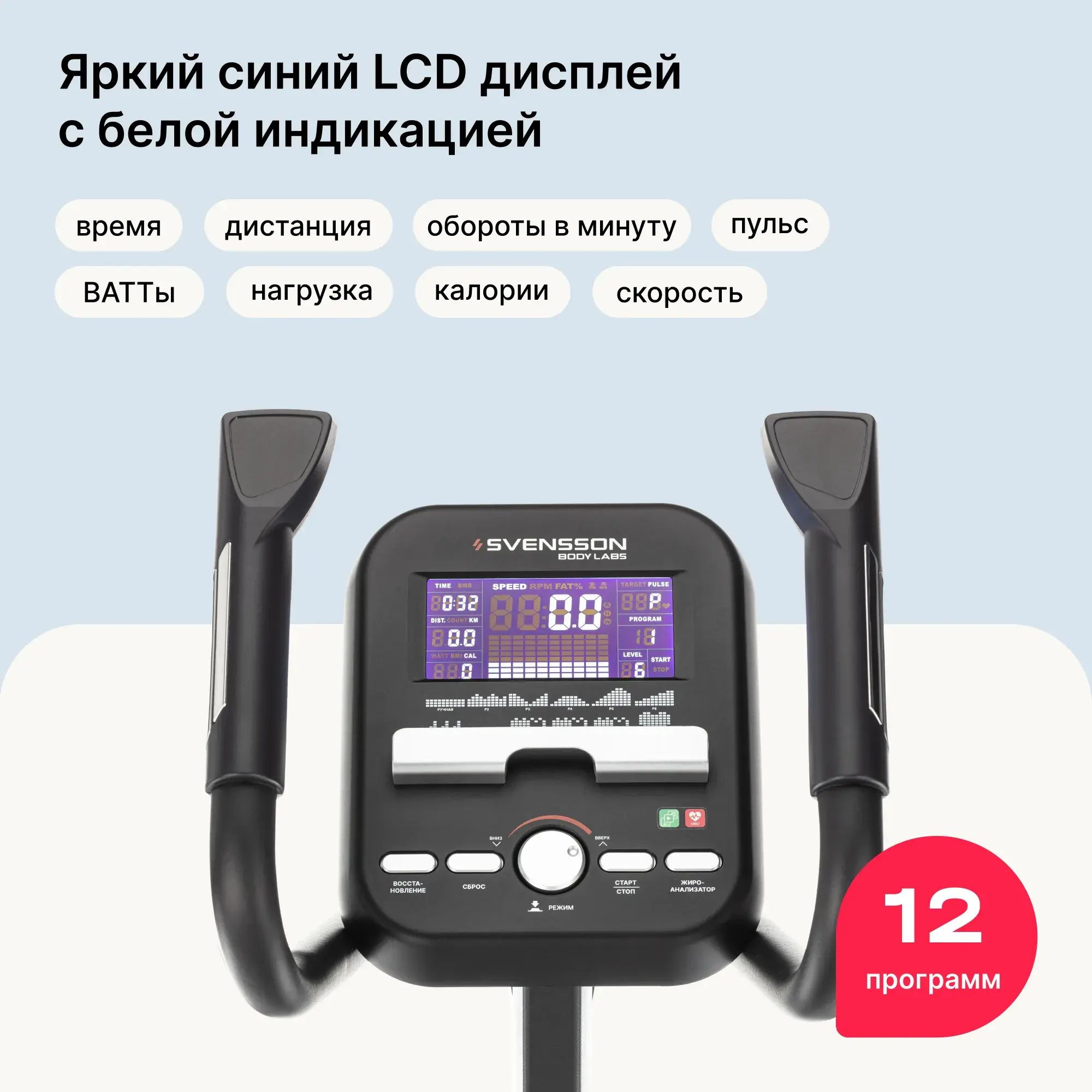 | Спецификация программ | быстрый старт, ручной режим, 6 предустановленных программ, 4 пульсозависимые программы, жироанализатор, пользовательский режим |