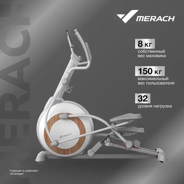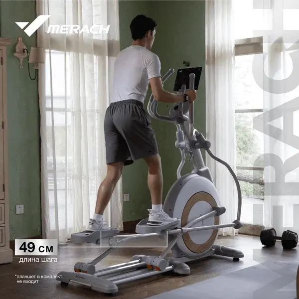 Эллиптический тренажер Merach K60 имеет надежную металлическую раму, которая рассчитана для 150 кг. Педали имеют широкие пластиковые платформы и алюминиевую рельсу для плавного скольжения. Компенсаторы неровностей пола помогают избежать опрокидывания устройства. С помощью модуля беспроводной связи Bluetooth можно подключить модель к смартфону. Приложение Merach позволяет выбрать комфортный режим тренировки, получить рекомендации или посмотреть статистику.
