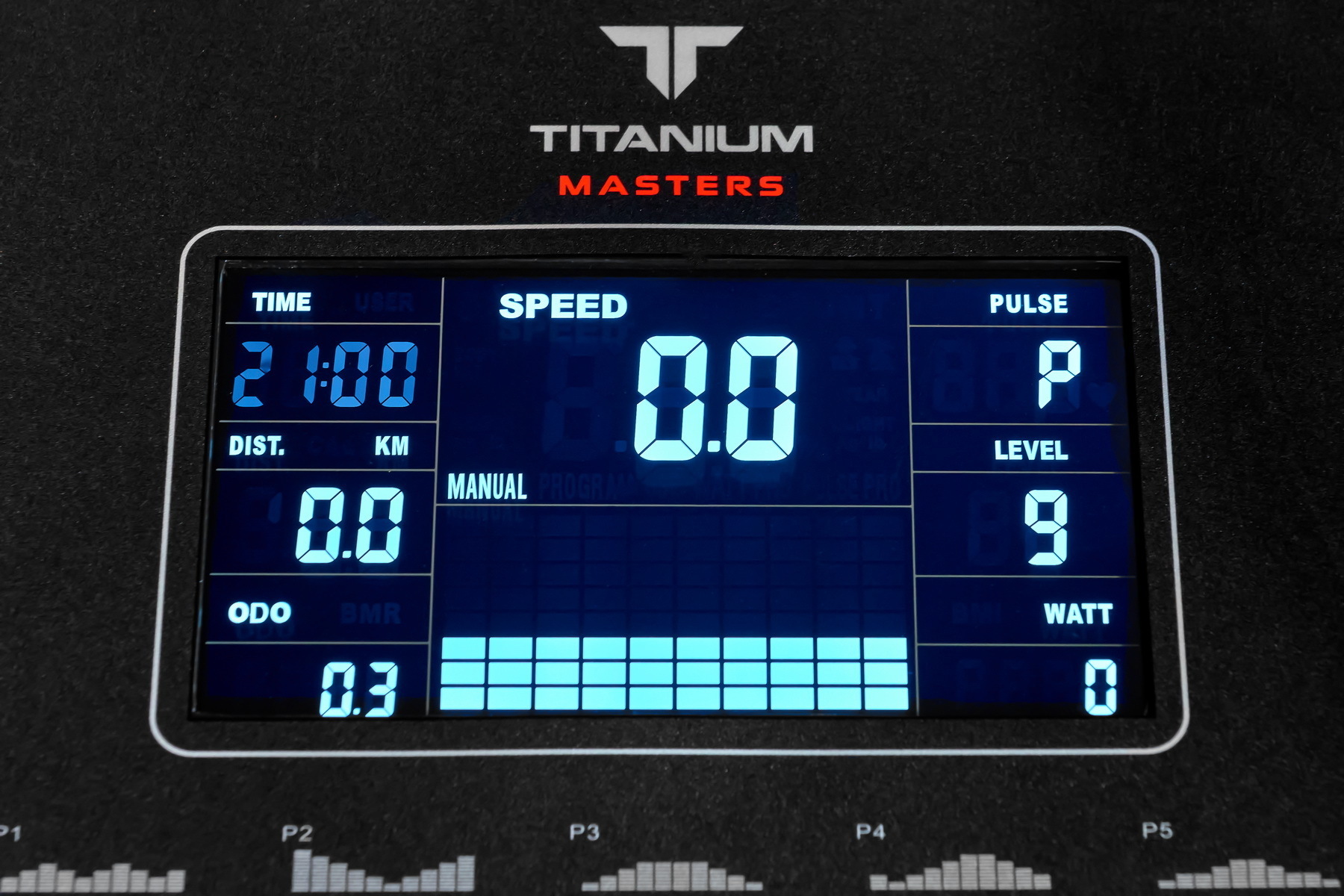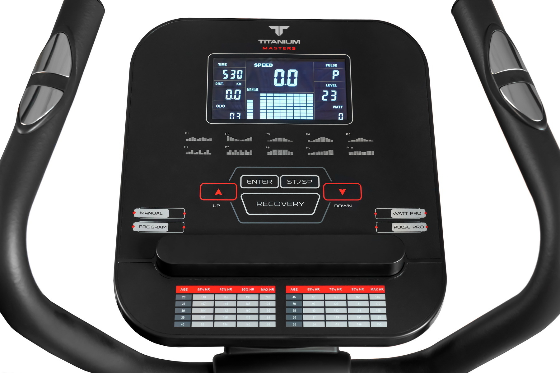 программный профиль, уровни нагрузки, время, дистанция, скорость, калории, обороты в мин., пульс, ватты, фитнес-тест (Recovery)