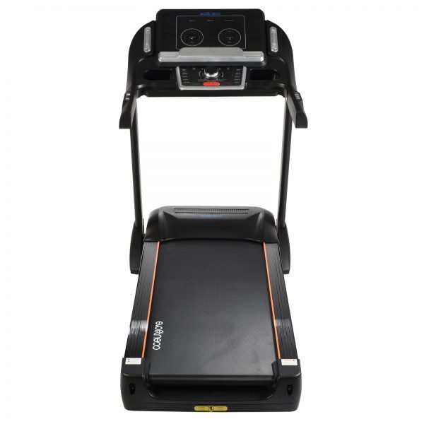 Русифицированная консоль очень удобна в использовании и имеет понятное интуитивное управление. Также на панель выводятся все ключевые данные о занятии: длительность, дистанция, потраченные калории и скорость движения. Запустить и остановить тренажер, а также отрегулировать скорость можно с помощью поворотного модуля управления. В программный пакет входит 12 предустановленных программ. За удобство складывания отвечает пневматическая система, она существенно облегчает складывание дорожки, а при раскладывании обеспечивает медленное опускание полотна, гарантируя легкость и безопасность.