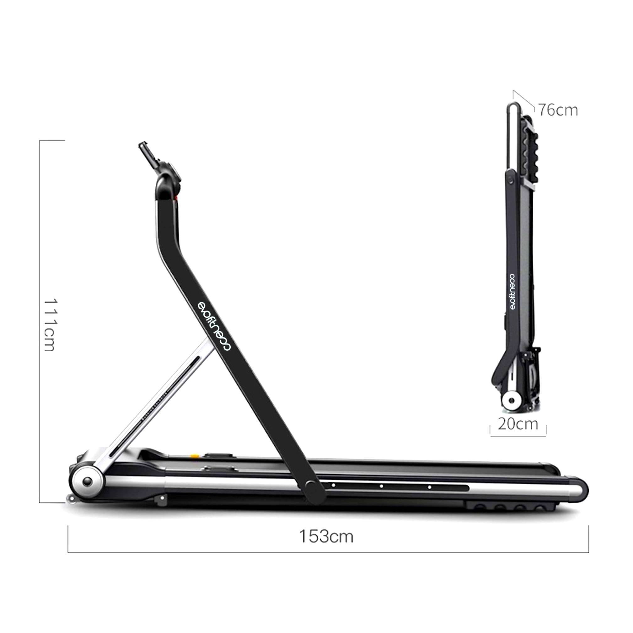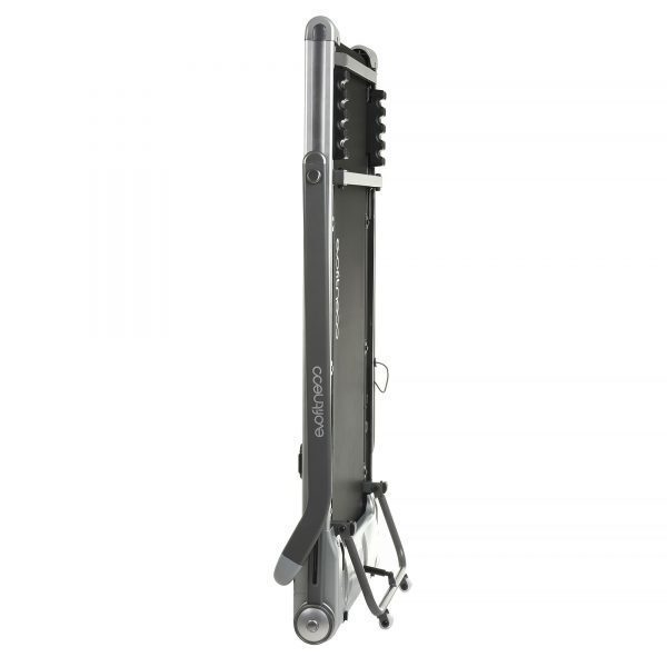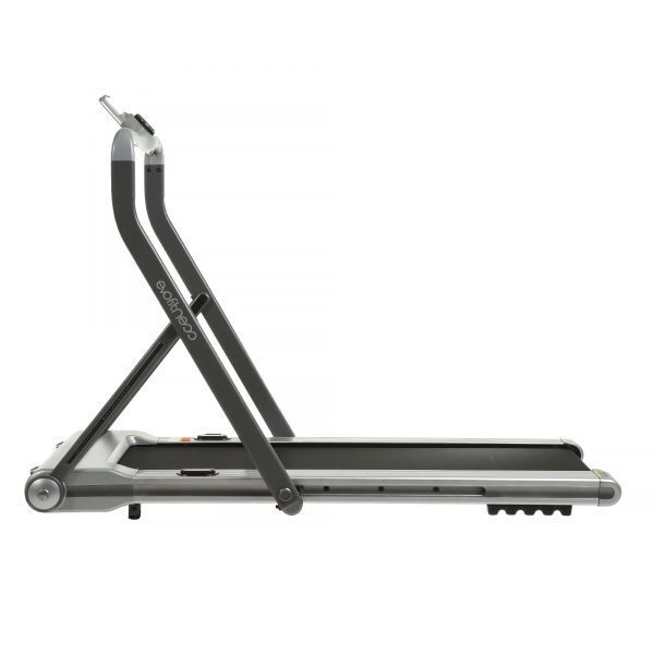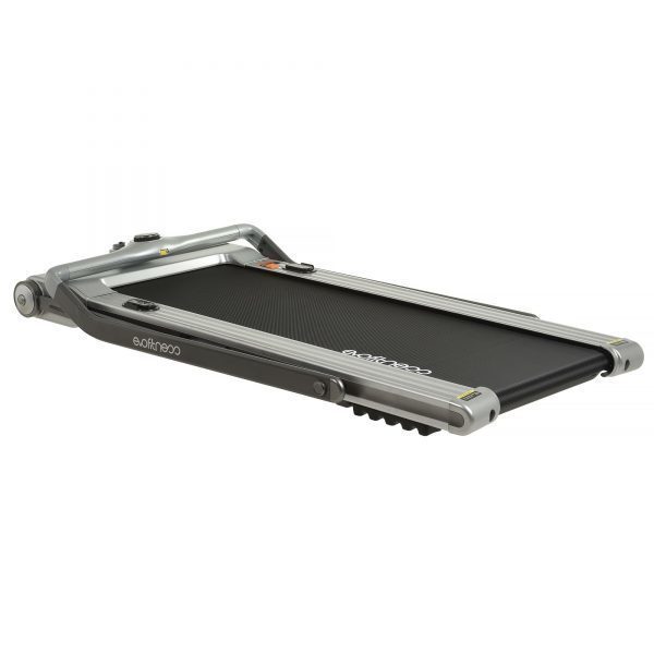 Тренажер имеет современный и стильный футуристичный дизайн, который безупречно подойдет к практически любому интерьеру. В тренажере реализована простая и удобная система складывания, которая позволяет существенно сэкономить полезное пространство. В сложенном виде беговая дорожка занимает в три раза меньше места, чем аналогичные дорожки с обычной системой складывания. Боковые стойки и консоль подвижные, и могут складываться в одной плоскости с полотном. В сложенном виде дорожка имеет высоту всего 20 сантиметров, что позволяет удобно хранить ее под мебелью или просто у стены вертикально или горизонтально.