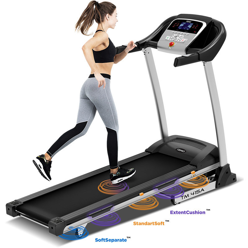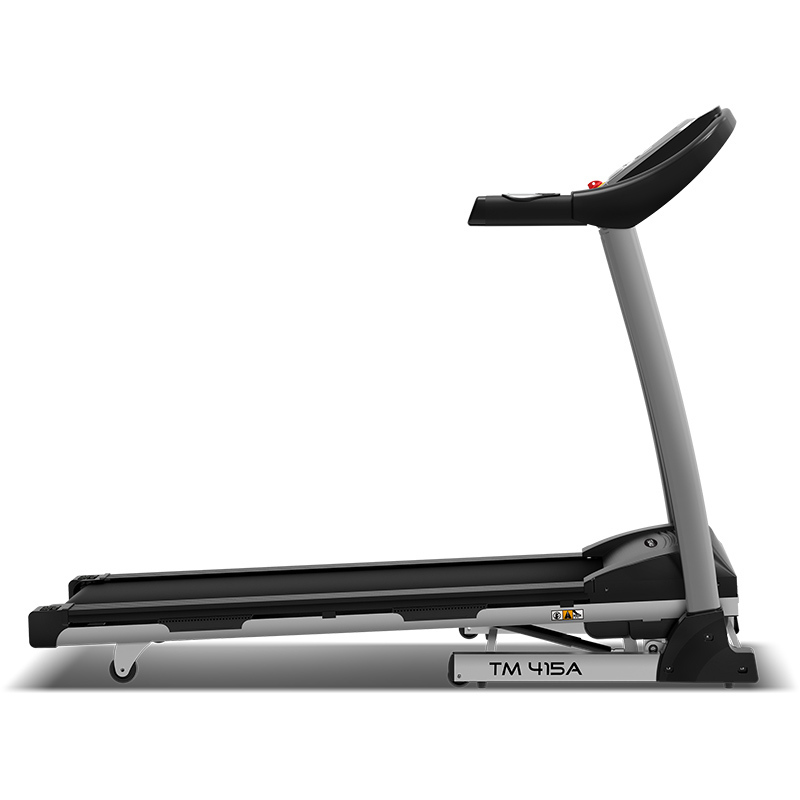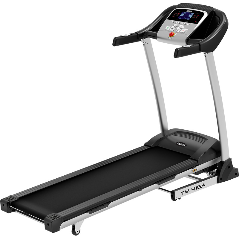 Надежная модель Family TM 415A это электрическая беговая дорожка для дома на прочной тяжелой раме, отличается большей мощностью двигателя 2 л.с., наличием электропривода для автоматического подъема – 15 уровней и допускает тренировки пользователям с весом до 120 кг. Надежный двигатель обеспечивает стабильный ход, поддерживает скорость от 0.8 до 14 км/ч, удлиненное беговое полотно Diamond™, шириной 400 х 1240 мм – оптимально подходит для бега и ходьбы. Трехсекционная система амортизации: SoftSeparate™ состоит из 2 эластомеров на корме полотна, 4 удлиненных эластомера ExtentCushion™ в основной рабочей зоне попеременно установлены с эластомерами StandartSoft™ для наиболее оптимальной настройки амортизации, обеспечивающей комфорт и безопасность при тренировках до 14 км/ч. Качественная ламинированная дека 16 мм и усиленная рама рассчитаны для пользователей весом до 120 кг. Надежность рамы обусловлена весом тренажера, значительно тяжелее аналогов. Электрическое изменение наклона – 15 уровней, позволяет увеличивать нагрузку не прерывая тренировку, менять наклон в зависимости от пожеланий и типа тренировки, что существенно увеличивает эффективность, пользу и более быстрое получение хорошего результата. Удобная и безопасная система хранения оборудована газовым доводчиком и роликами перемещения.
