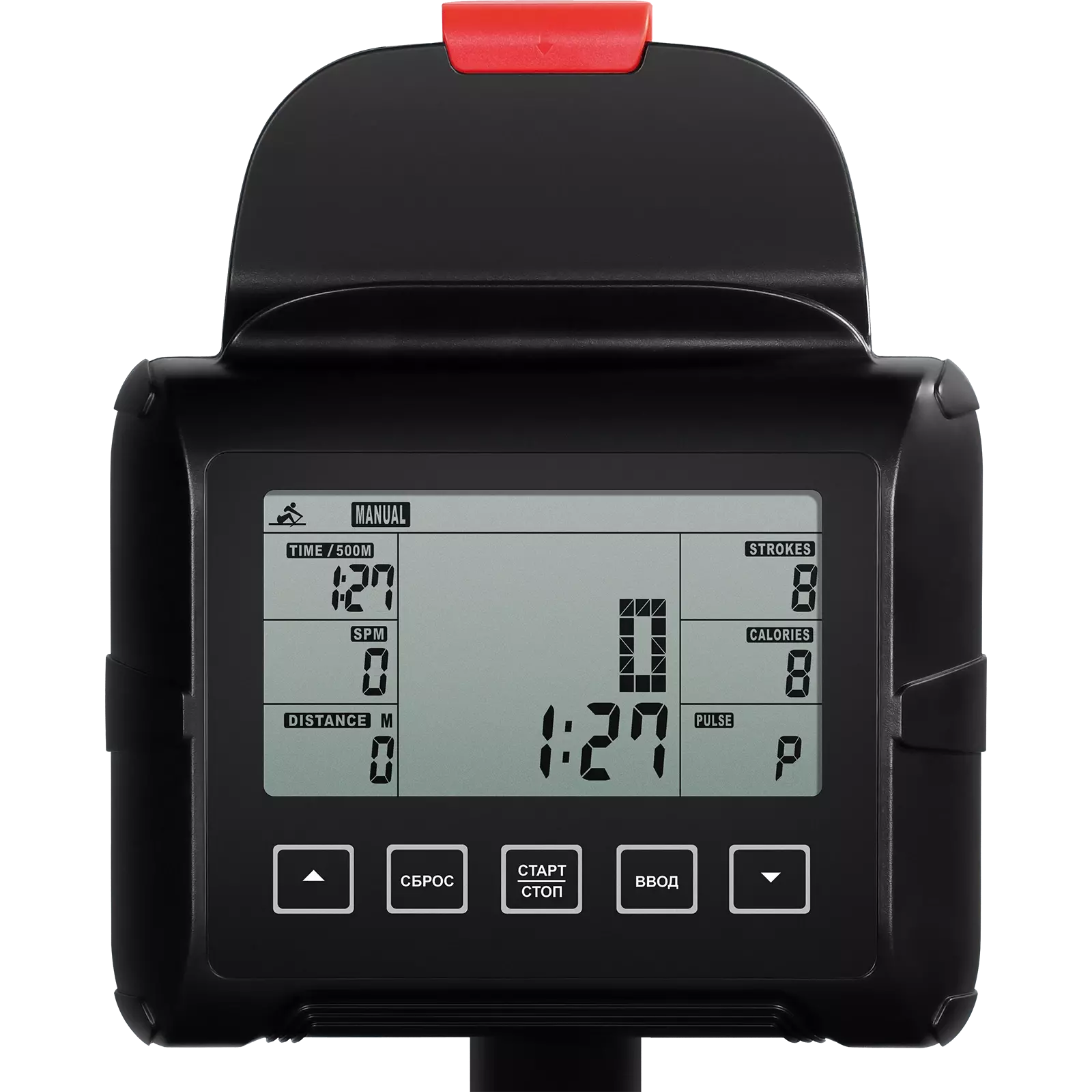 Компьютер управления с контрастным LCD дисплеем 5” включает оптимальный пакет программ и встроенный HRC модуль, который позволяет использовать беспроводной датчик пульса 5 кГц. Консоль совместима с приложением Kinomap / iConsole+. Клавиши управления на русском языке, что позволяет легко настроить все необходимые функции и параметры тренировки. На дисплее отображаются все основные параметры тренировки: время, среднее время на 500 м., темп, количество гребков, дистанция, пульс, калории. Пакет программ состоит из 5 целевых тренировок: дистанция, время, калории, пульс, количество гребков, 15 режимов соревнования разной сложности и программы «Быстрый старт».