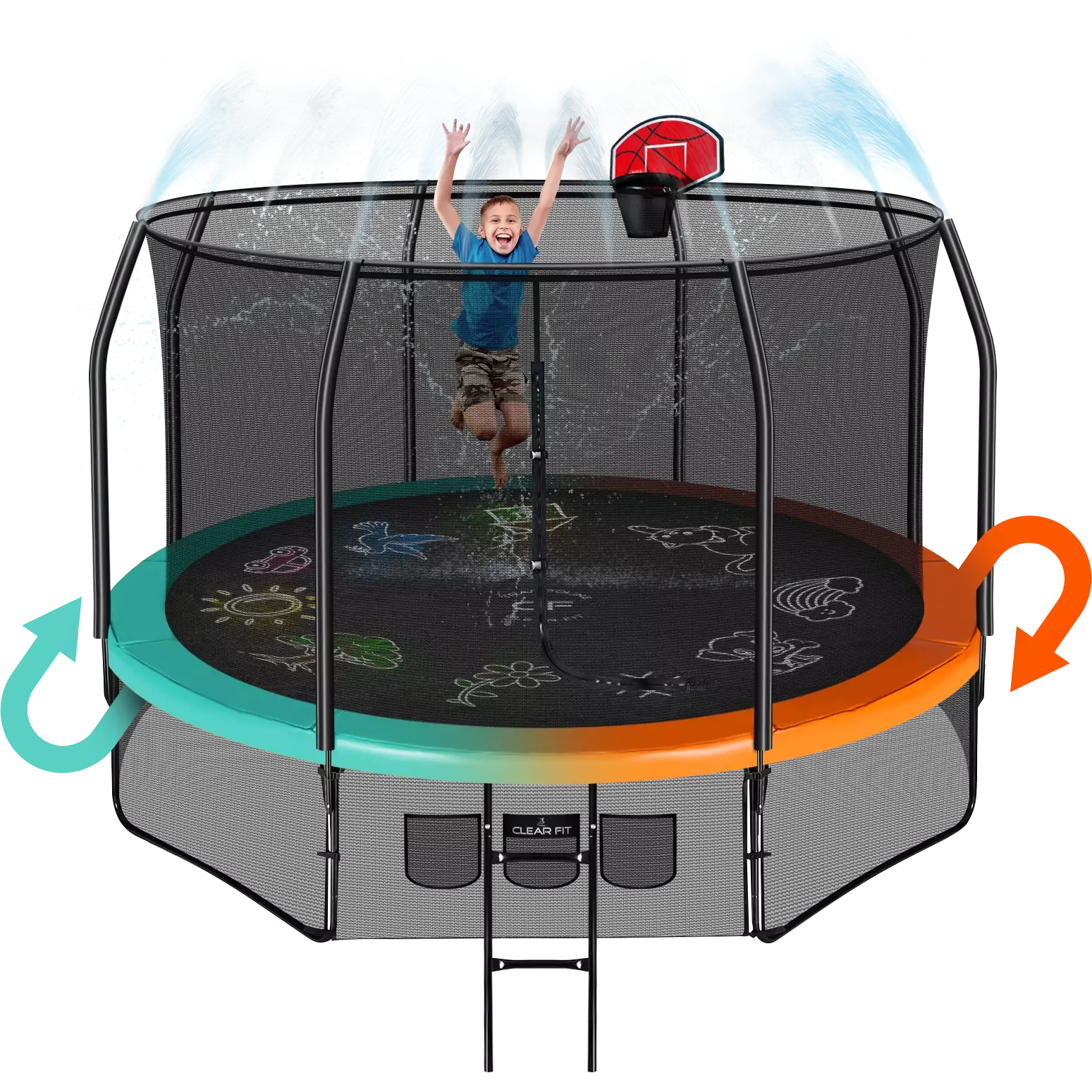 - Занимательный мат-раскраска, освежающие брызги и аэробаскетбол (для батутов размером 10, 12, и 14 футов подходит сет для баскетбола с соответствующим модели кронштейном).