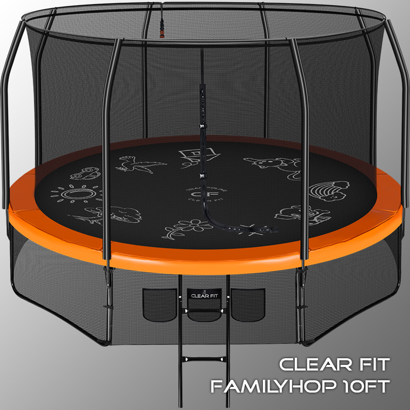 Батут Clear Fit серии FamilyHop — современная концепция семейного батута, объединившая все достоинства предыдущих поколений и учитывающая пожелания пользователей. Основной акцент серии на безопасность, надежность и развлечения для любого возраста. Мощный каркас из толстостенных труб, проверенные метизы, качественные пластик и материалы защиты, износостойкое прыжковое полотно и удобное крепление обеспечивают комфорт и безопасность для каждого члена семьи. Каркасное крепление защитной сети — удобное и надежное, прямое крепление к прыжковому полотну и дополнительная защита входа. Защитный мат — двусторонний, Вы можете выбрать цвет батута при установке и менять его по настроению — ярко оранжевый или изумрудный. В комплект входит спринклер, устанавливается по периметру батута, в жаркий день можно подключить подачу воды и наслаждаться прохладными брызгами. Для малышей на полотно нанесены рисунки — можно раскрашивать цветными мелками. Дополнительно к батутам размеров 10, 12 и 14 футов можно приобрести сет для баскетбола. Батуты FamilyHop поставляются в максимальной комплектации: батут, верхняя защитная сеть, цокольная защитная сеть, лестница, спринклер. Диаметр прыжковой поверхности 2.62 м идеально подходит для дачного участка, размеры полотна позволяют комфортно тренироваться взрослым и развлекаться детям любого возраста. Верхняя защитная сеть оберегает от падений, нижняя защитная сеть исключает случайное попадание под батут во время тренировки. Качественные материалы и мощная рама предусматривают эксплуатацию батута 10FT пользователями до 150 кг.