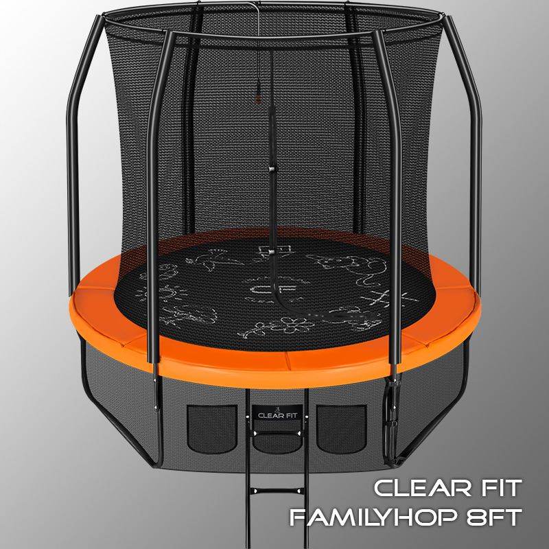 Батут Clear Fit серии FamilyHop — современная концепция семейного батута, объединившая все достоинства предыдущих поколений и учитывающая пожелания пользователей. Основной акцент серии на безопасность, надежность и развлечения для любого возраста. Мощный каркас из толстостенных труб, проверенные метизы, качественные пластик и материалы защиты, износостойкое прыжковое полотно и удобное крепление обеспечивают комфорт и безопасность для каждого члена семьи. Каркасное крепление защитной сети — удобное и надежное, прямое крепление к прыжковому полотну и дополнительная защита входа. Защитный мат — двусторонний, Вы можете выбрать цвет батута при установке и менять его по настроению — ярко оранжевый или изумрудный. В комплект входит спринклер, устанавливается по периметру батута, в жаркий день можно подключить подачу воды и наслаждаться прохладными брызгами. Для малышей на полотно нанесены рисунки — можно раскрашивать цветными мелками. Дополнительно к батутам размеров 10, 12 и 14 футов можно приобрести сет для баскетбола. Батуты FamilyHop поставляются в максимальной комплектации: батут, верхняя защитная сеть, цокольная защитная сеть, лестница, спринклер. Диаметр прыжковой поверхности 3.8 м идеально подходит для пользователей любого возраста, размеры полотна позволяют комфортно тренироваться взрослым и развлекаться детям, включая подростков. Верхняя защитная сеть оберегает от падений, нижняя защитная сеть исключает случайное попадание под батут во время тренировки. Качественные материалы и мощная рама предусматривают эксплуатацию батута 14FT с нагрузкой до 200 кг. Каркасное крепление защитной сети — напрямую к прыжковому полотну, не только более надежно, но и создает аккуратный общий вид батута, без провисания сети, экономит время сборки и увеличивает рабочее пространство. Тренировки на батуте — это отличная аэробная нагрузка: улучшения общей физической формы, заряд положительными эмоциями, улучшение работы кардиоваскулярной системы, развитие чувства равновесия и координации в пространстве для пользователей любого возраста. Занятия на свежем воздухе укрепляют иммунитет, снабжают организм кислородом, повышают выносливость как у детей, так и у взрослых. Именно поэтому мы используем только высококачественные комплектующие с большим запасом прочности. В большинстве случаев батуты данного типа устанавливаются под открытым небом, обязательные требования к материалам — это влагостойкость, термоустойчивость, в том числе и к низким температурам, переносимость ультрафиолетовых лучей и износостойкость. Конструкция для обеспечения безопасности выполнена из нержавеющей стали Q195, диаметр стальных труб W-опор и каркаса 42 мм. Каркас из труб толщиной 1.6 мм соединяется с помощью мощных сварных Т-образных кронштейнов из металла толщиной 2.05 мм и высококачественных гальванизированных метизов. Порошковая окраска основных элементов и двойная оцинковка всех труб конструкции исключает коррозию, увеличивает срок эксплуатации тренажера. Прыжковое полотно — это основной элемент батута. Материал прыжкового полотна Перматрон (Permatron) — эластичный материал, способный возвращаться в исходное состояние при постоянном воздействии с разным усилием. Термообработка волокон материала обеспечивает высокую прочность на разрыв и стрессоустойчивост