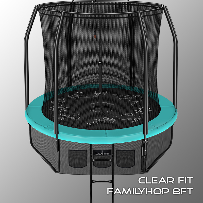 Каркасное крепление защитной сети с прямым креплением к прыжковому полотну и дополнительной защитой входа обеспечивает максимальную надежность и безопасность, придает более аккуратный внешний вид батуту. Толстостенный профиль каркаса, соединение — сварные Т-образные кронштейны. Высокая надежность конструкции, только высококачественные комплектующие. Оцинкованный каркас и порошковая окраска основных элементов. Батуты Clear Fit можно устанавливать как под открытым небом, так и в помещениях. Их легко устанавливать, разбирать, хранить и перемещать. Использование только проверенных гальванизированных пружин и метизов. Безопасность: защитная внутренняя сеть исключает падение с высоты, 3-слойный мат — соприкосновение с пружинным механизмом, двойная молния с фиксатором входа — случайное открытие, цокольная защита исключает попадание под батут посторонних предметов и уберегает окружающих, малышей и домашних питомцев. Занимательный мат-раскраска, освежающие брызги и аэробаскетбол (для батутов размером 10, 12 и 14 футов подходит сет для баскетбола с соответствующим модели кронштейном). При прыжках на батуте задействовано практически 100% мышц, зрительная и нервная системы. Прыжки на батуте подходят детям и взрослым без ограничения по возрасту — универсальный тренажер. Час тренировки в фитнес-клубе легко заменят 15—20 минут прыжков на батуте под открытым небом. Прыжки на батуте в течение 10 минут — это 3 км бега средней интенсивности. Занятия на батуте развивают координацию, ориентацию в пространстве, вестибулярный аппарат и реакцию. Занятия на свежем воздухе укрепляют иммунитет, снабжают организм кислородом, повышают выносливость как у детей, так и у взрослых. Батуты ClearFit — это безопасное, полезное и, главное, совместное времяпрепровождение родителей и детей.