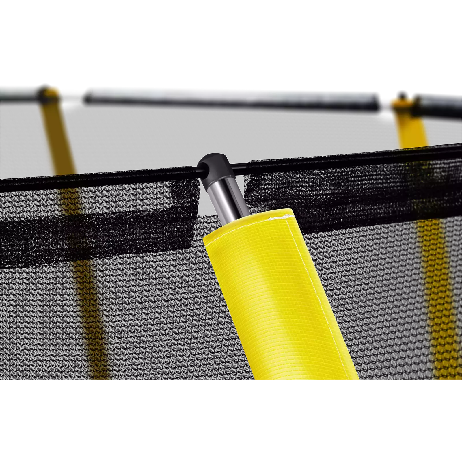 Защитная сеть входит в обязательную комплектацию батутов. Инновационное крепление увеличивает рабочее пространство батута, исключает соприкосновение с пружинным механизмом, все элементы крепления закрыты мягким матом или выполнены из безопасных материалов. Каркасное крепление позволяет использовать одинарные стойки, что увеличивает обзор, увеличивает полезную нагрузку батута и снижает стоимость. Материал защитной сети - 100% Polyethylene, основные свойства — это прочность, эластичность, низкая адгезия, морозостойкость, амортизация (нечувствителен к ударам), рабочая температура —40 C°...80 C°, устойчив к ультрафиолету. Вход на усиленной молнии, оборудован дополнительными фиксаторами (карабинами), защищен от случайного открывания. На металлические стойки надеты влагозащитные чехлы, внутри мягкий вспененный слой 7.5 мм.